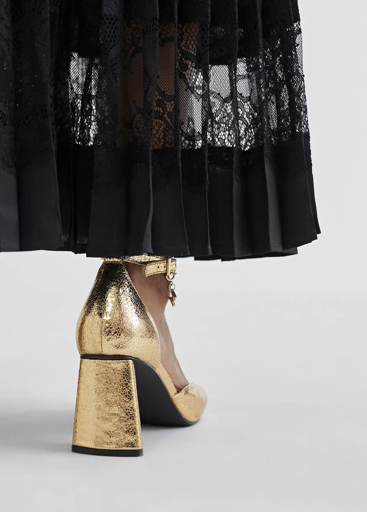 Vestido largo plisado con encaje a tono en el bajo. Escote halter con cadera dorada. Lazada en parte superior espada.