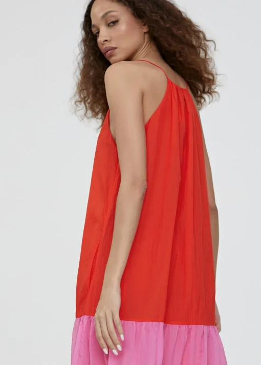 Vestido tricolor, largo y fluido. Escote pico y tirantes finos.