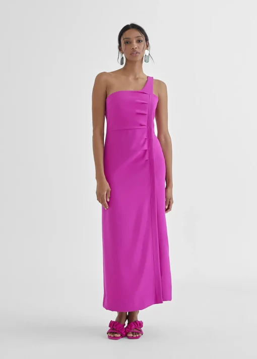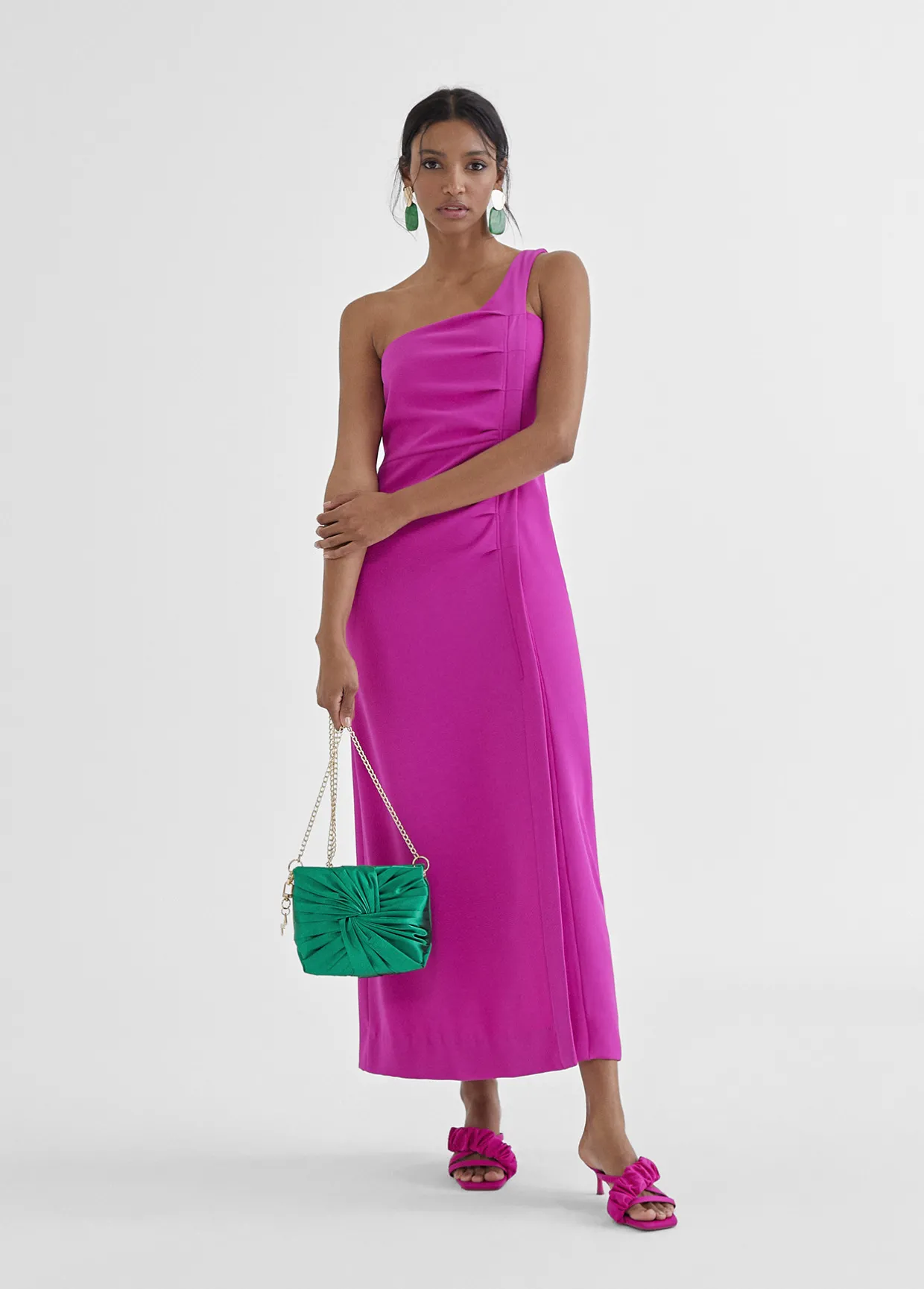 Vestido mono color de largo midi y escote asimétrico. Fruncido en costado con abertura lateral.