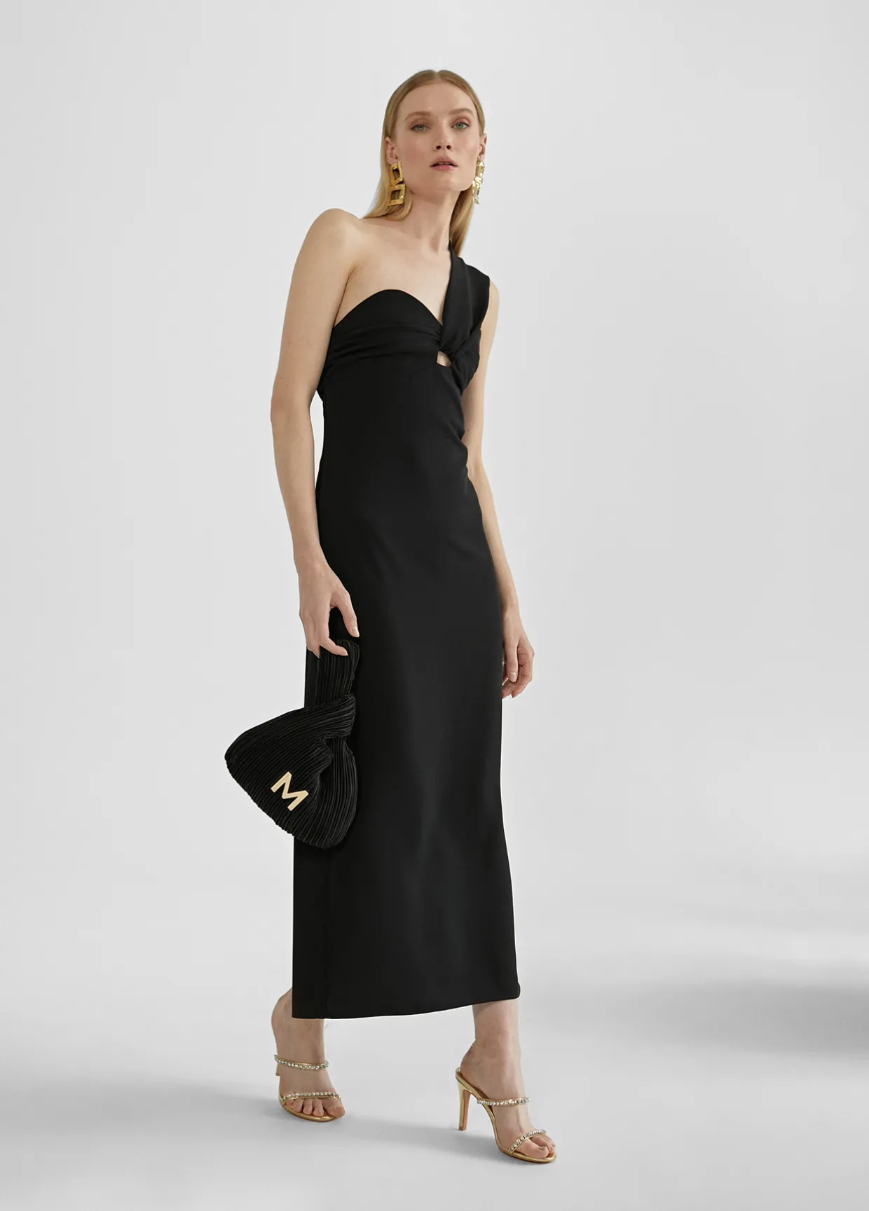 Vestido mono color de largo midi. Escote corazón con tirante asimétrico.