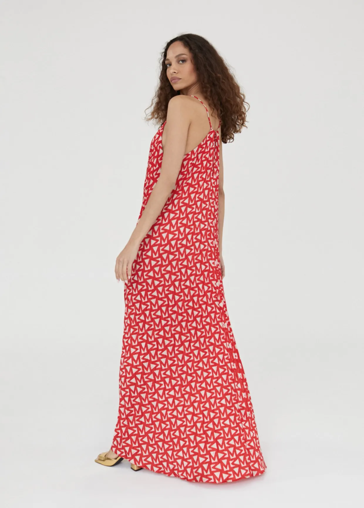 Vestido largo plisado. Estampado monograma M bicolor. Escote con abertura en frontal y espalda.