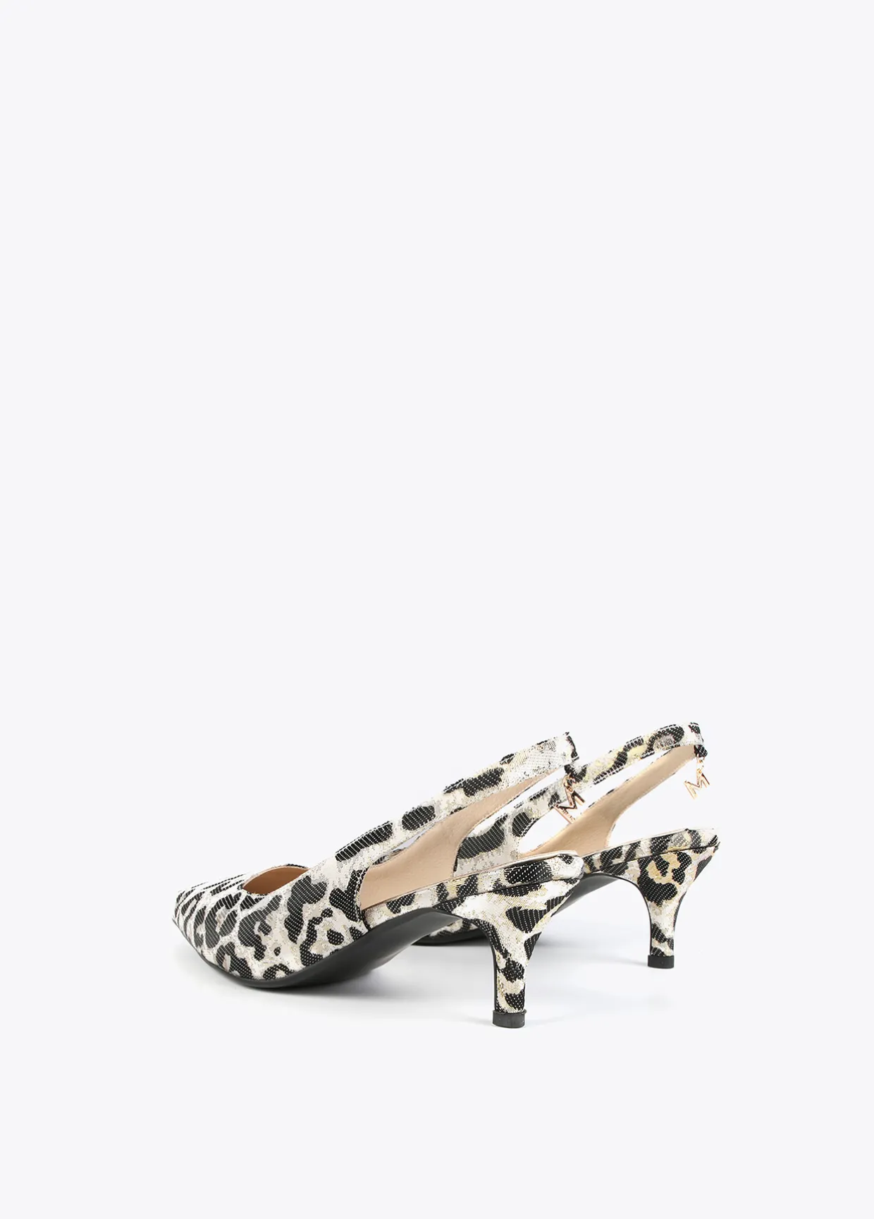 Zapato tipo salón destalonado con tacón medio y estampado animal leopardo. Detalle medallita logo dorado y plantilla logotipada.
