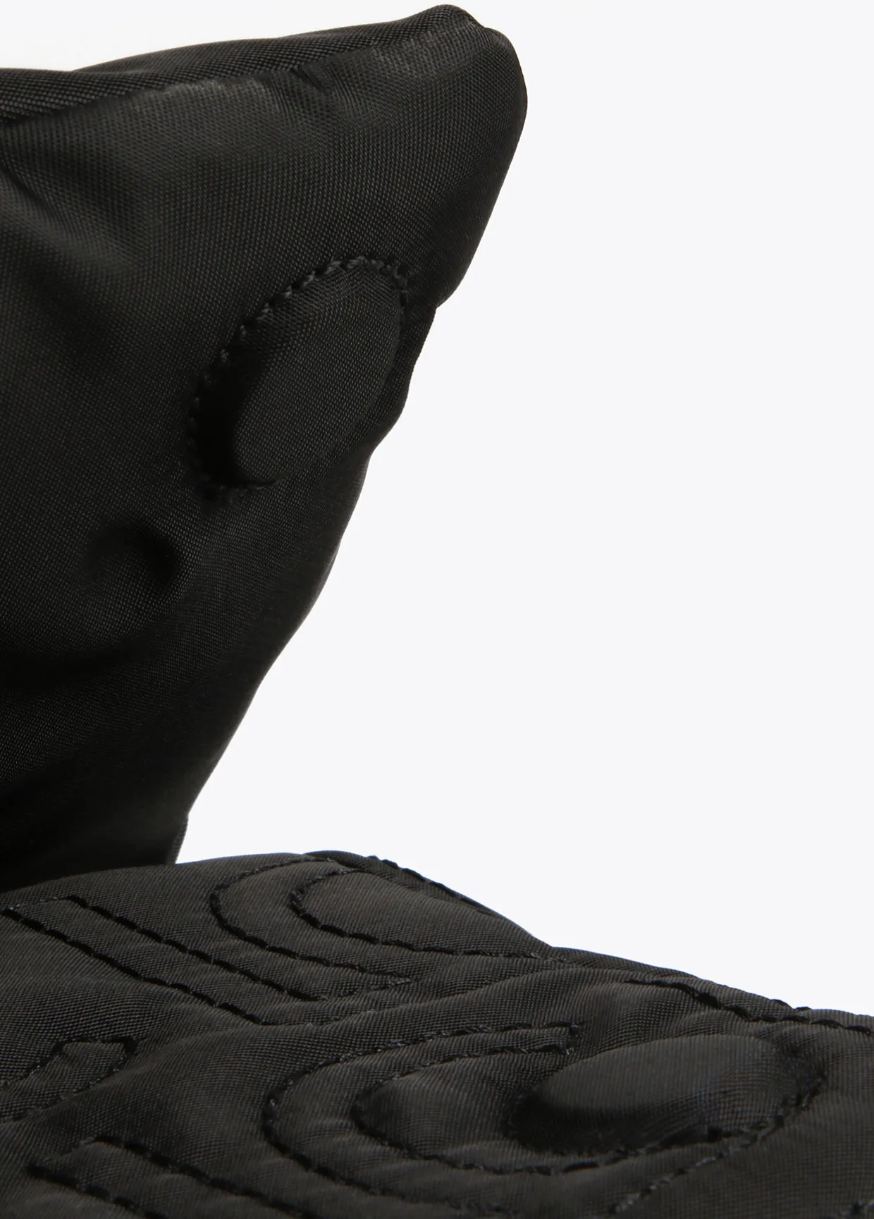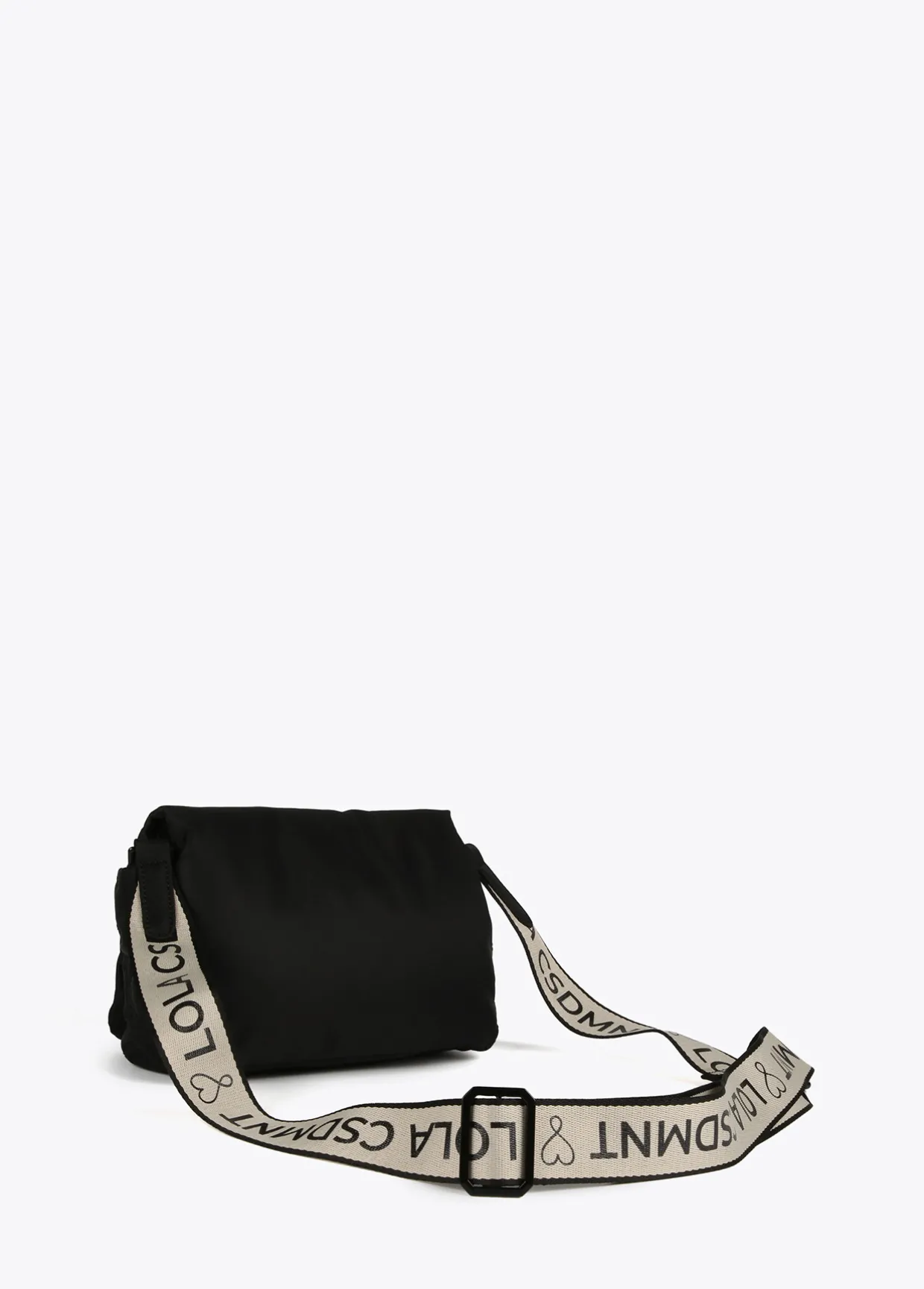 Bolso tipo bandolera acolchada de nylon con monograma bordado. Asa bandolera ajustable y extraíble y cierre en solapa con botones imantados.