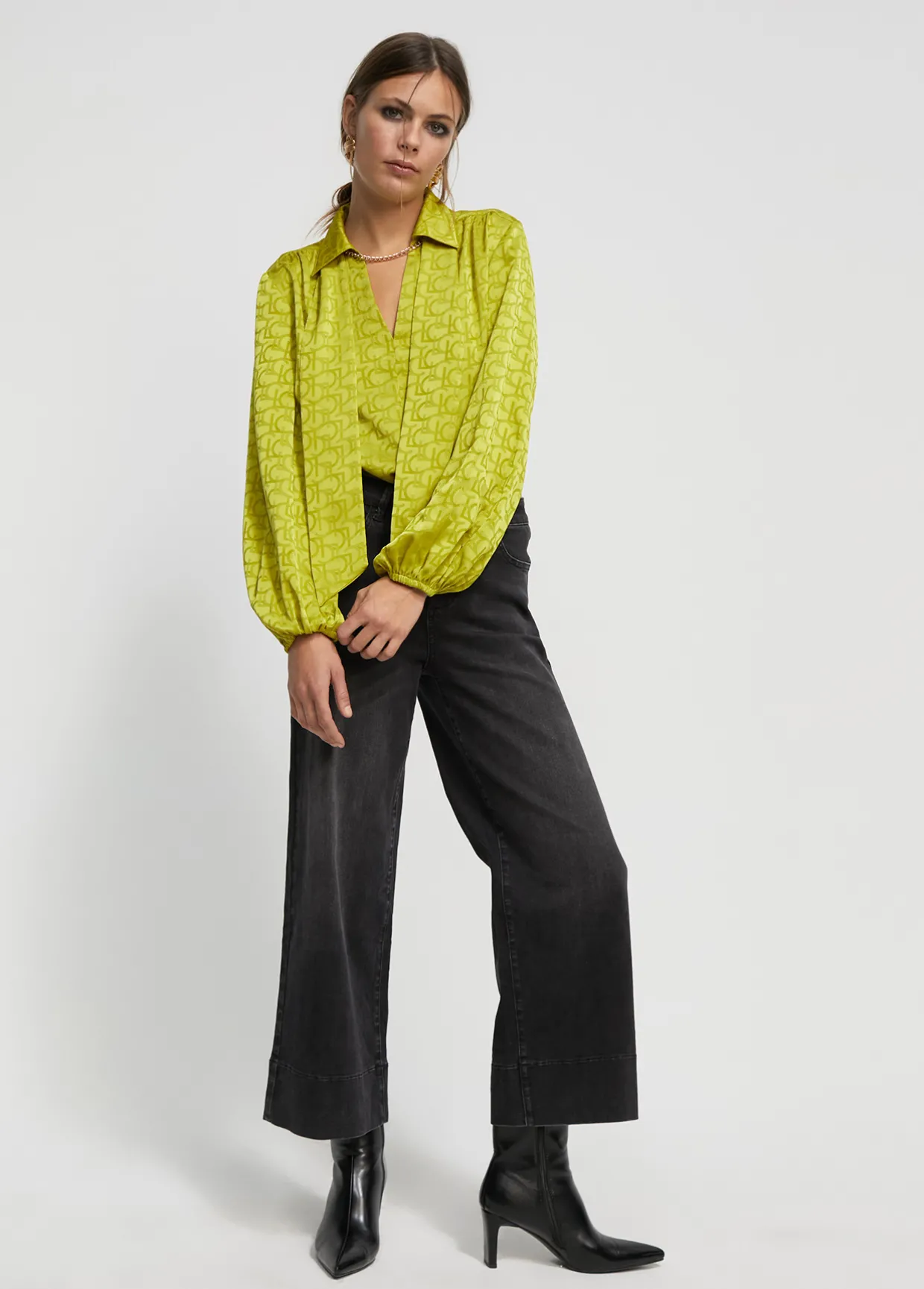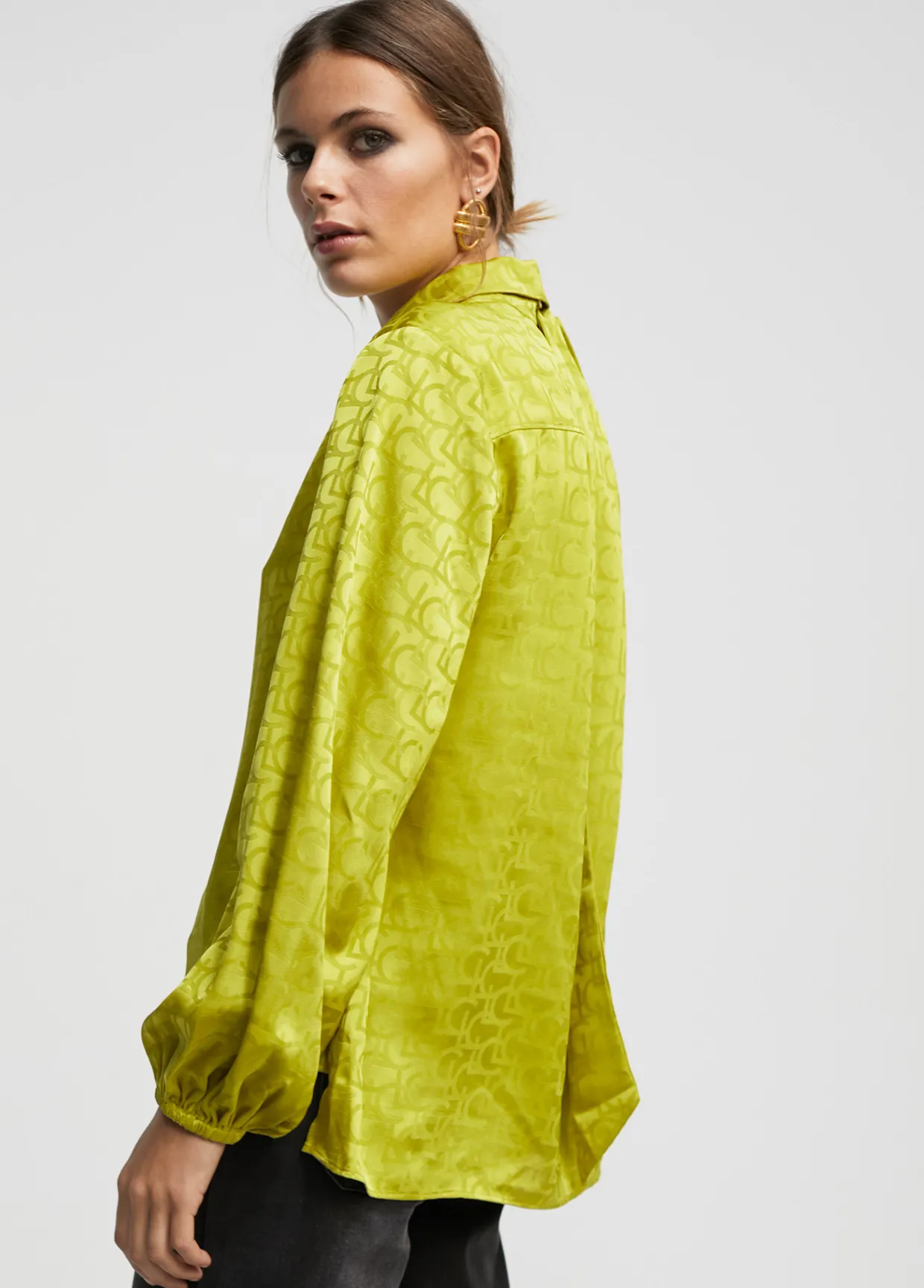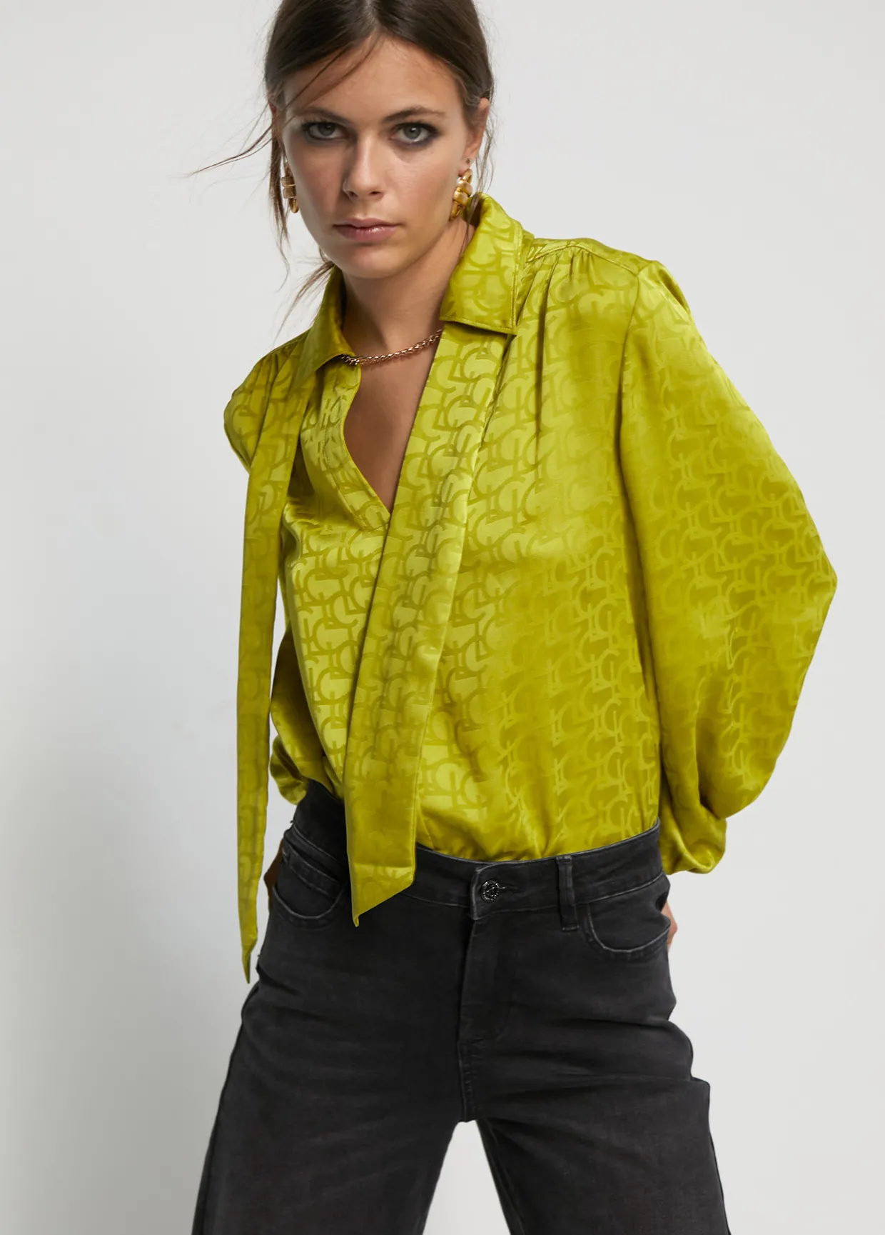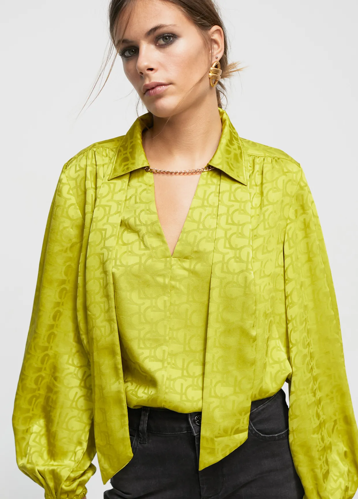 Blusa de tejido logotipado a tono. Con escote pico y lazo del mismo tejido, estampado y color. Mangas ligeramente abollonadas con puños elásticos.
