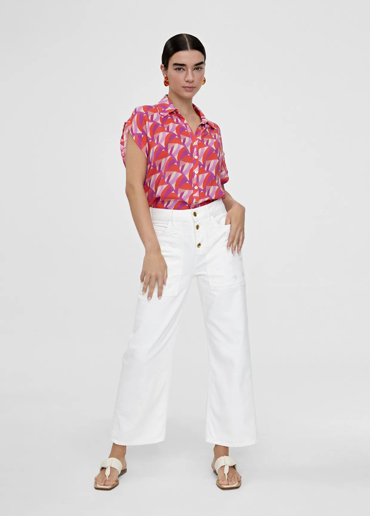 Blusa fluida. Estampado maxi geométrico en frontal y tipo corbatero en espalda. Cuello camisero y manga caída. Cerrada con botones dorados.