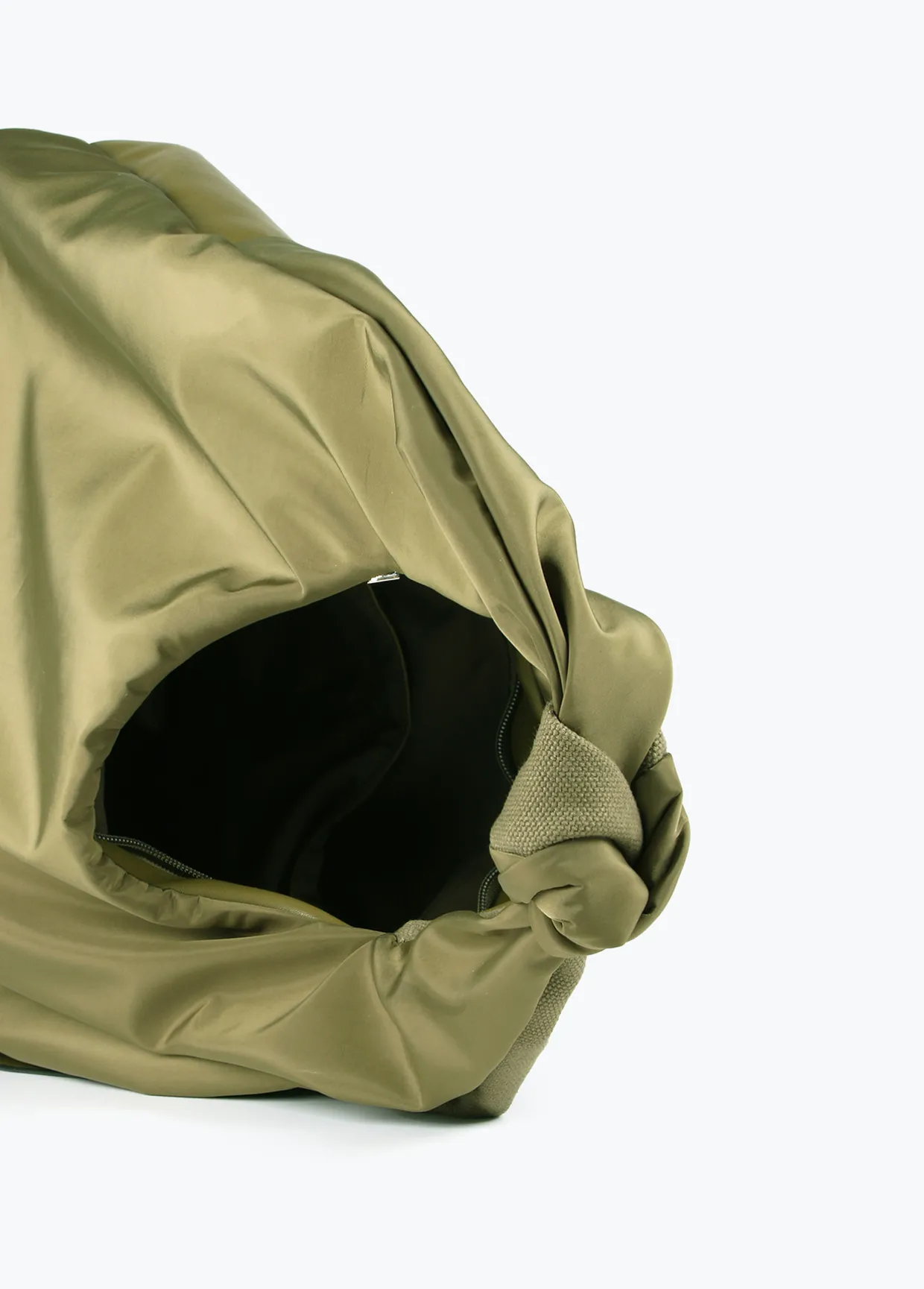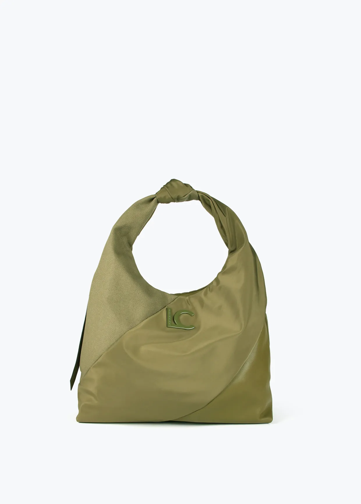 Bolso shopper de hombro de tres materiales combinados. Nudo en asa y logo lacado en zona frontal. Cierre principal y bolsillo lateral con cremallera.