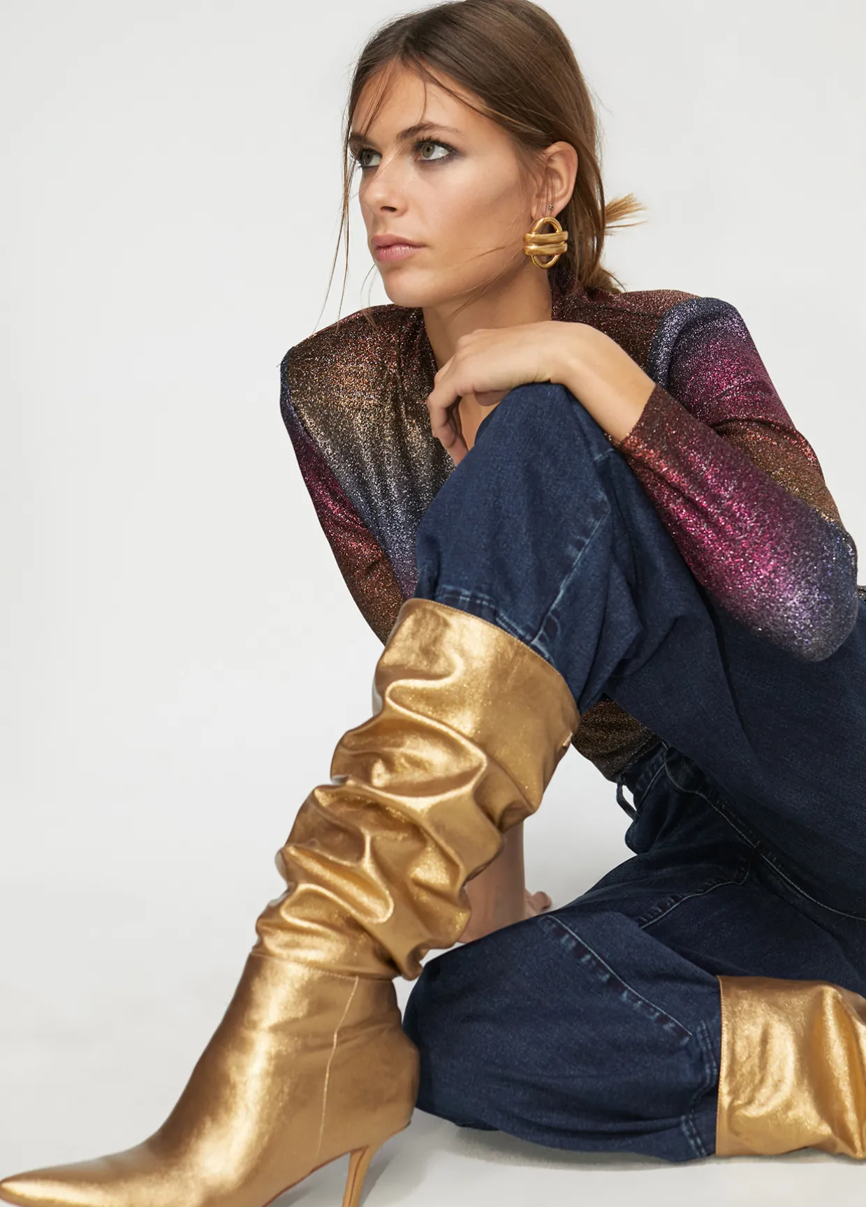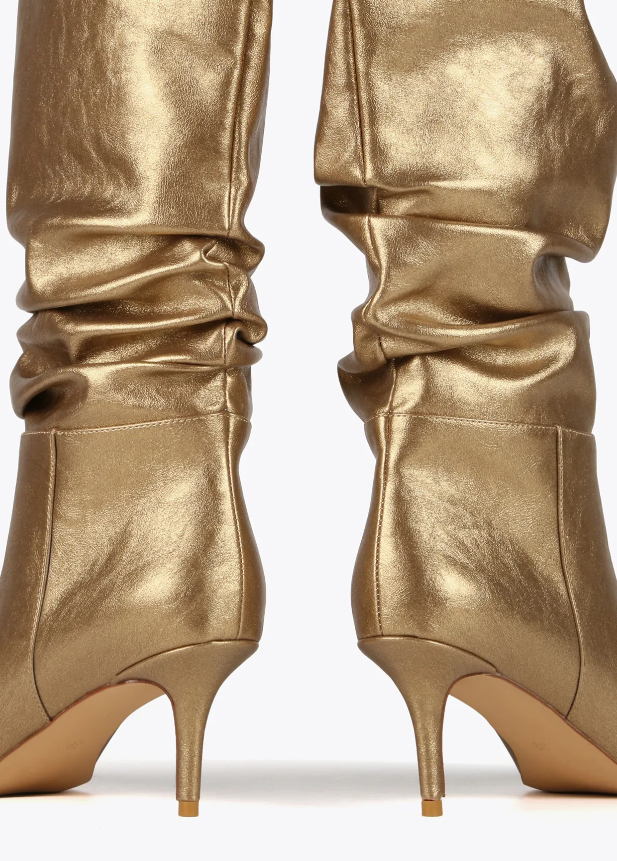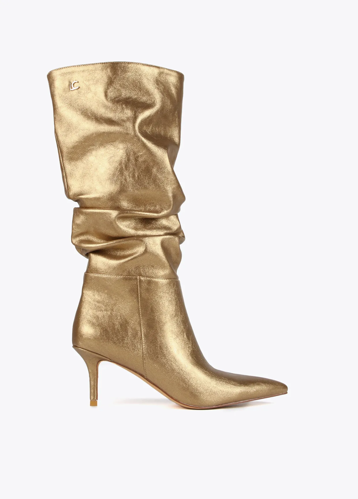 Bota de tacón con caña alta fruncida y letras logo en laterales.
