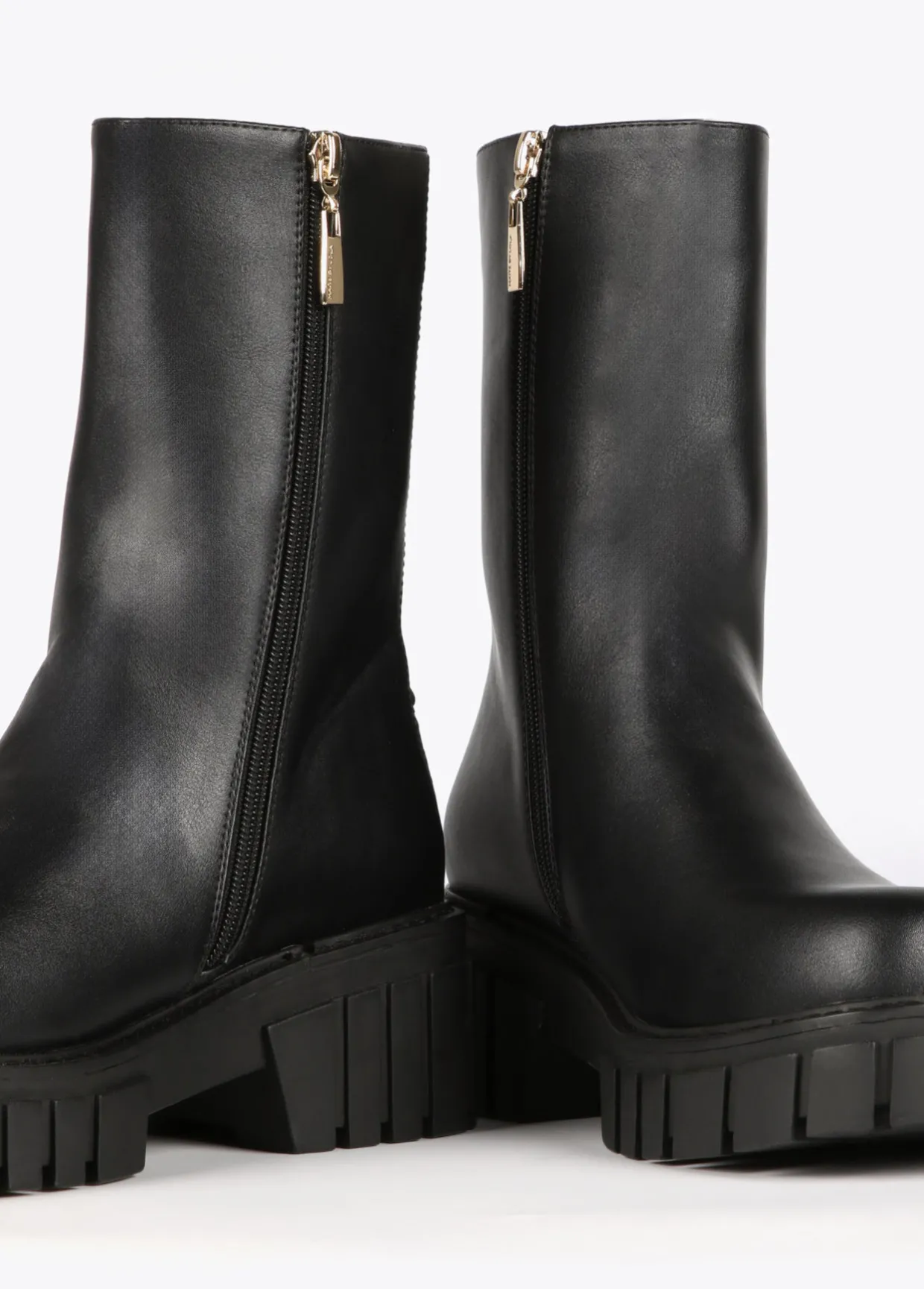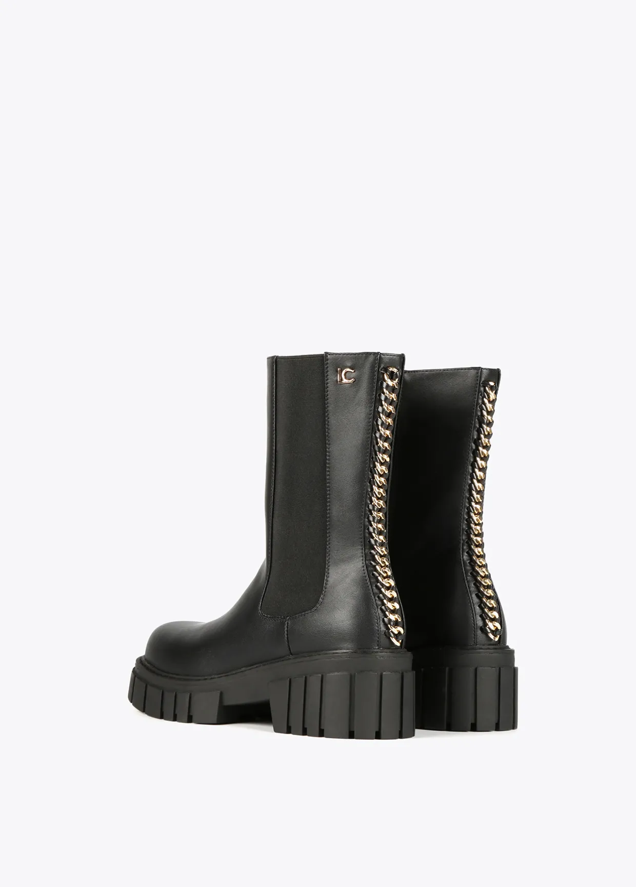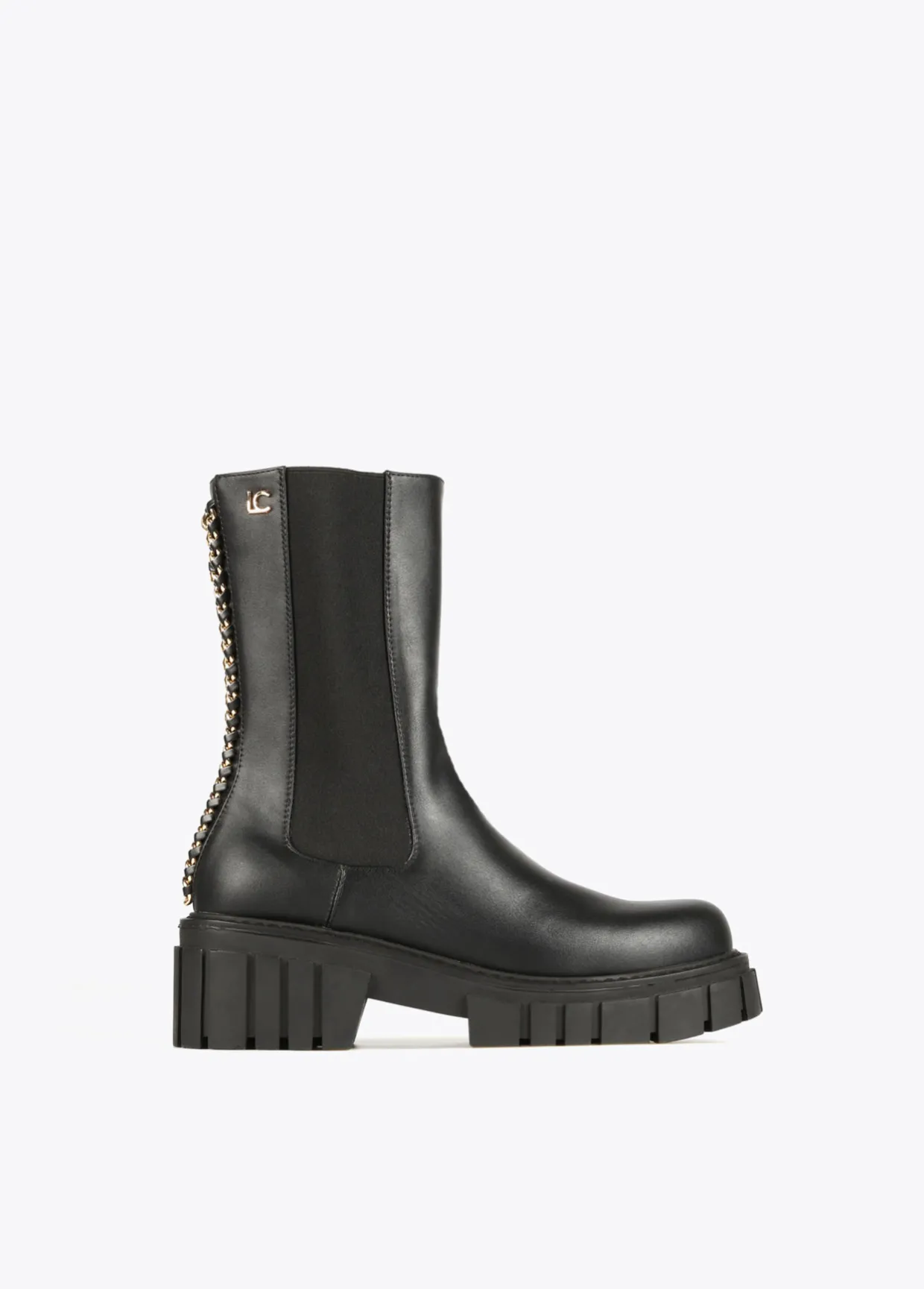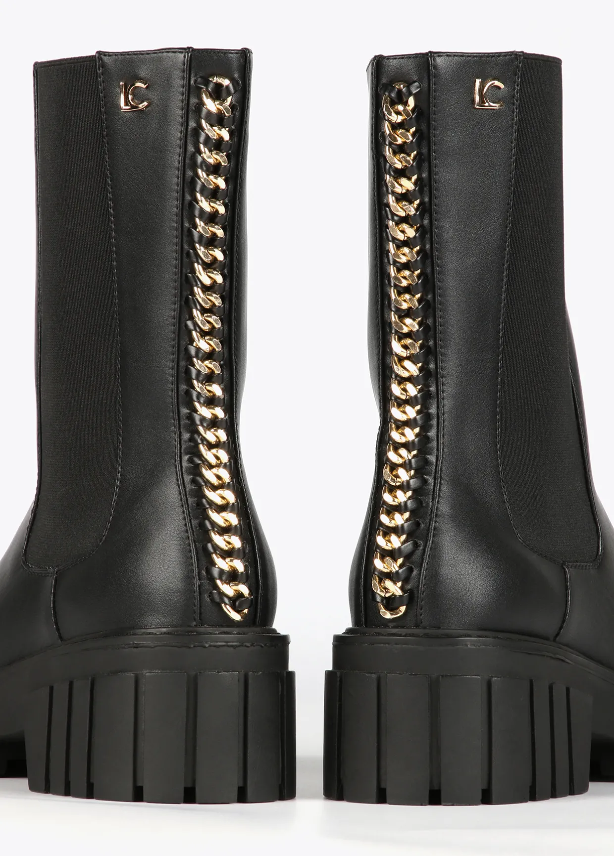 Botín negro con detalle cadena dorada en parte trasera y letras logo en lateral. Suela tipo track y cremallera lateral.