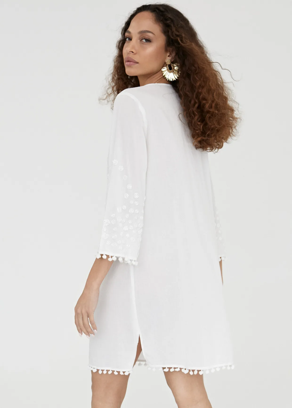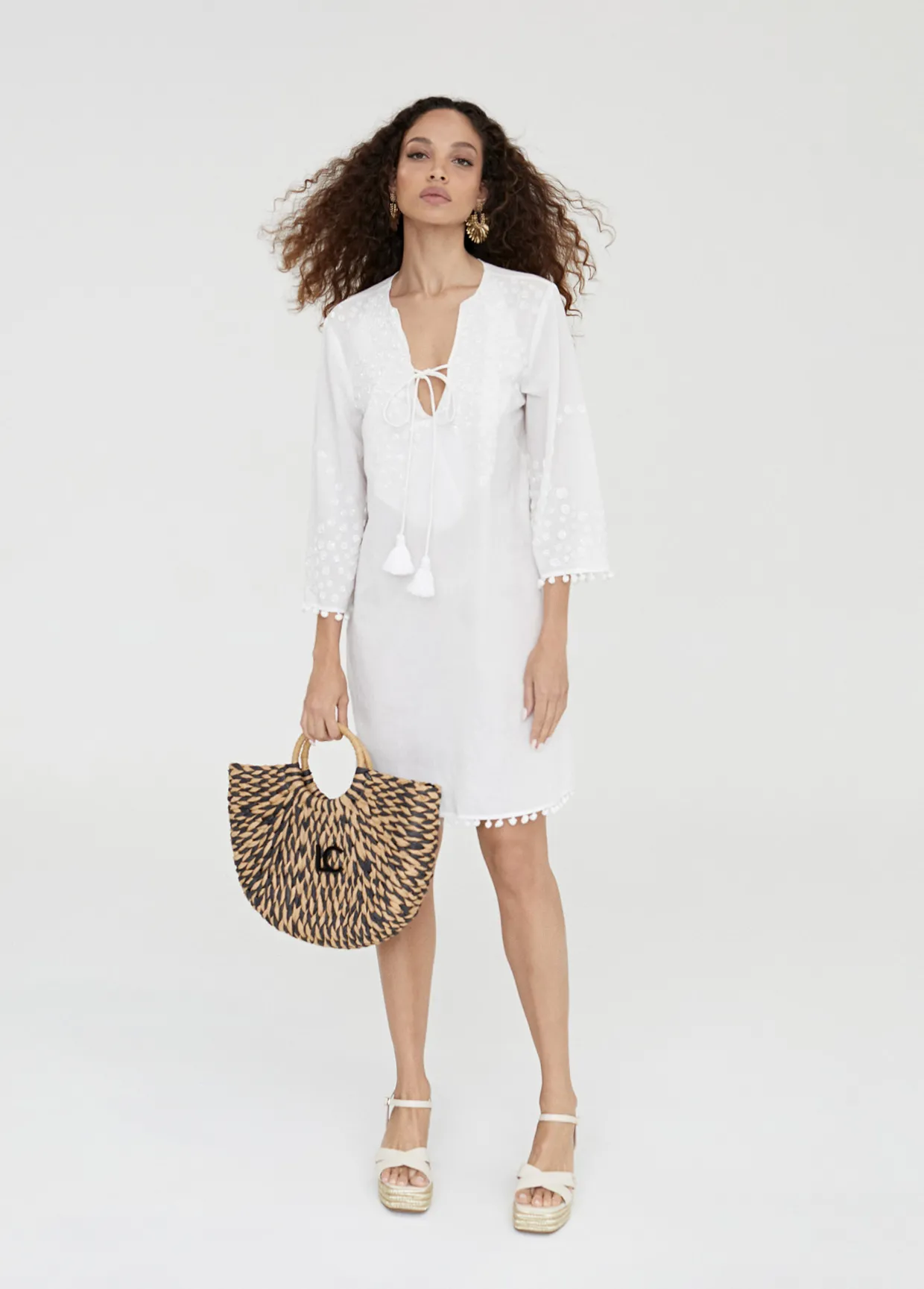 Caftan corto escote pico con anudado. Bordado contrastado en pechera y en media manga. Pequeñas aberturas en bajo.