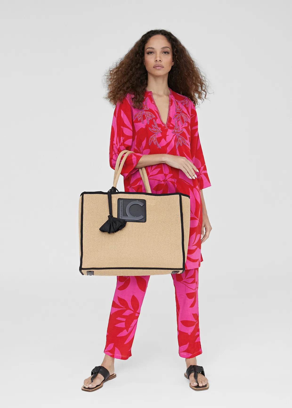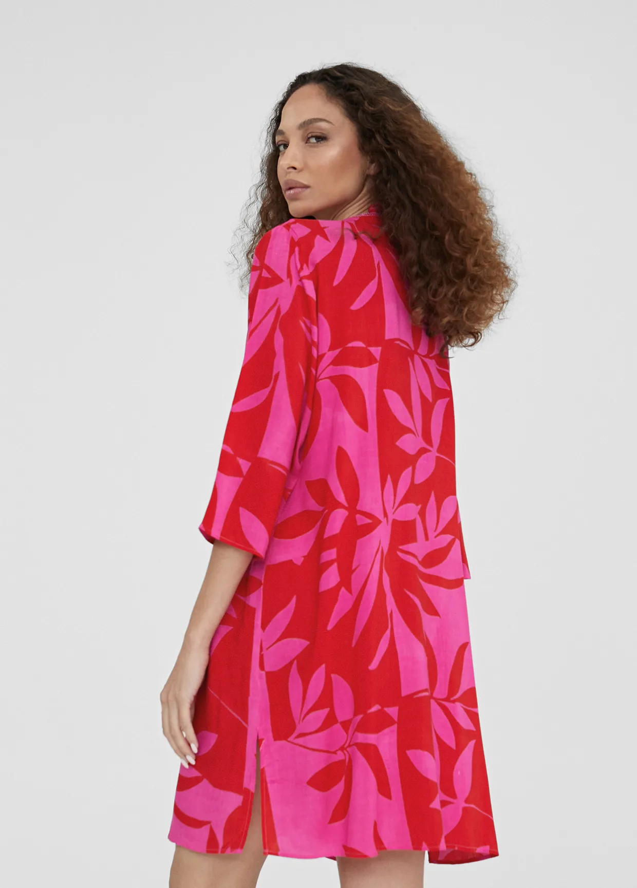 Caftan corto estampado bicolor. Cuello mao y escote pico. Bordado en pechera. Media manga. Aberturas laterales.