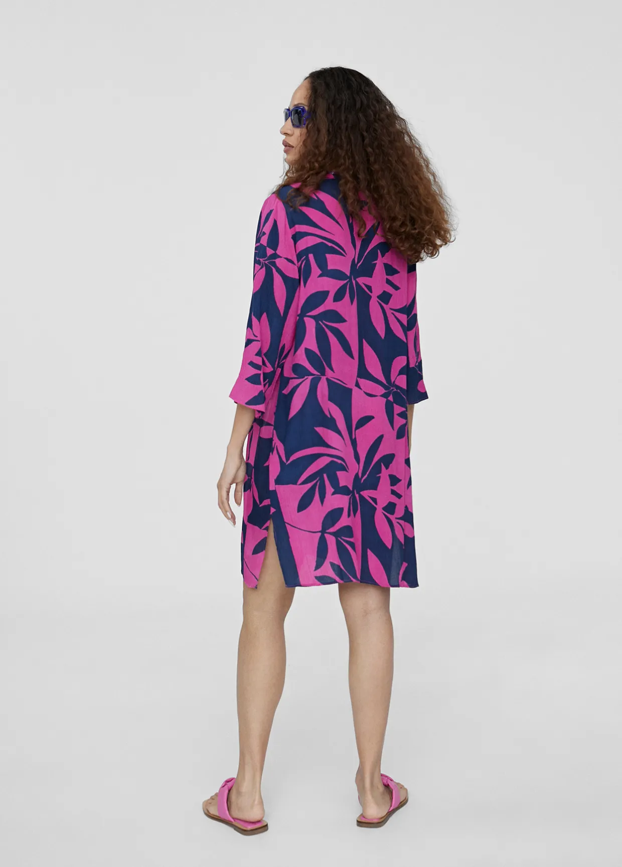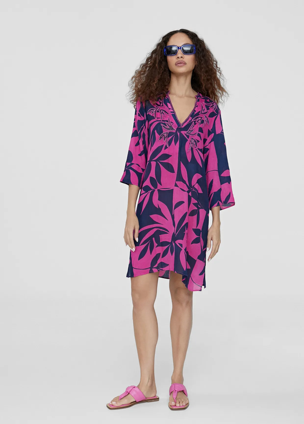 Caftan corto estampado bicolor. Cuello mao y escte pico con bordado frontal. Media manga. Aberturas laterales.