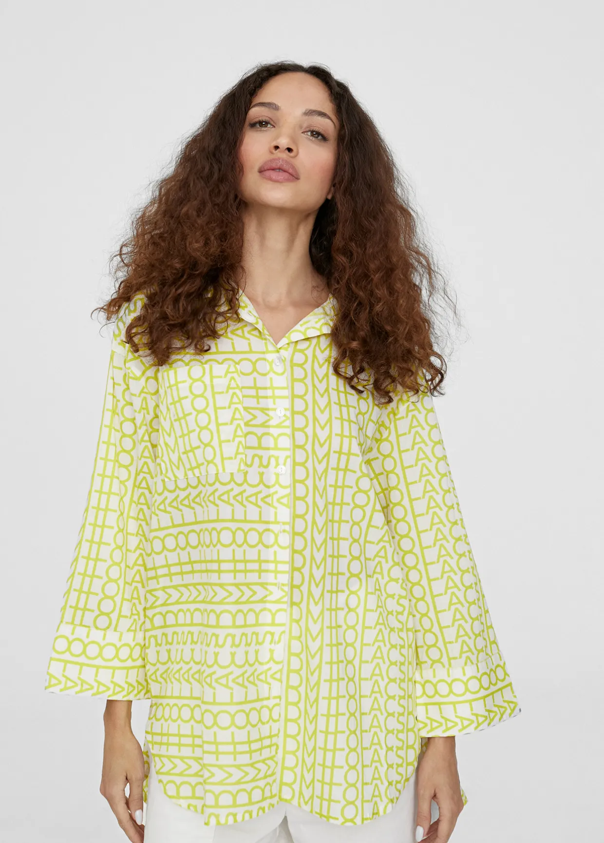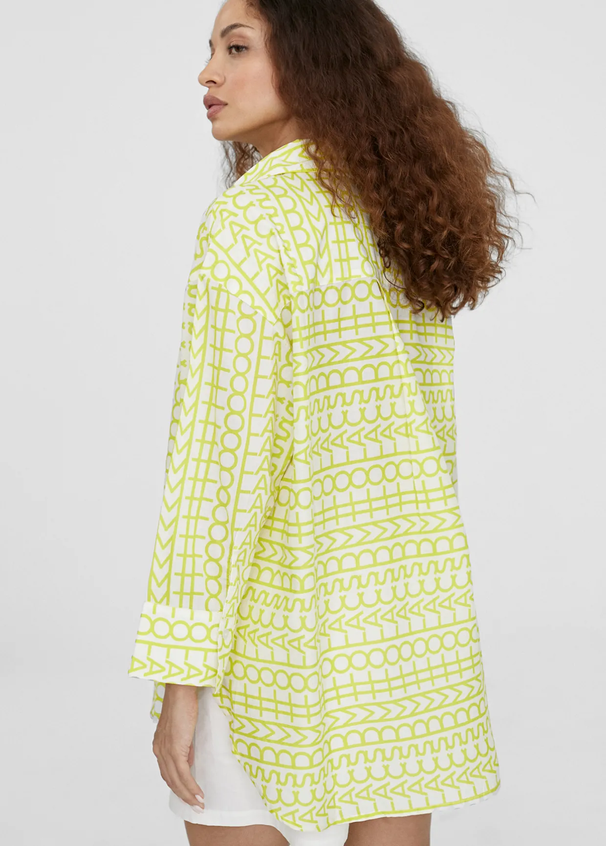 Camisa oversize logotipada . Cuello camisero y puño en mangas. Cierre con botones y aberturas laterales. Pliegue en espalda.