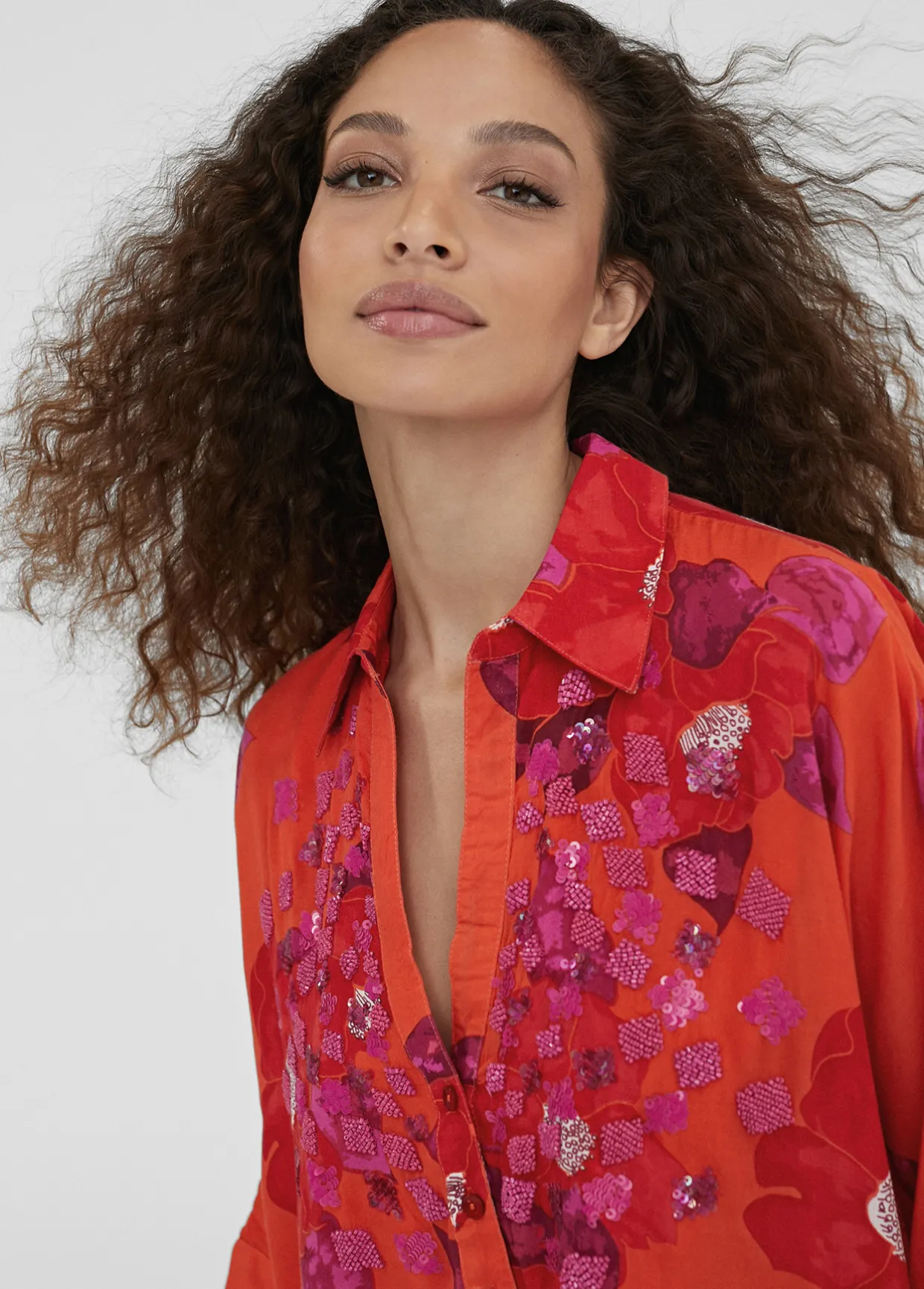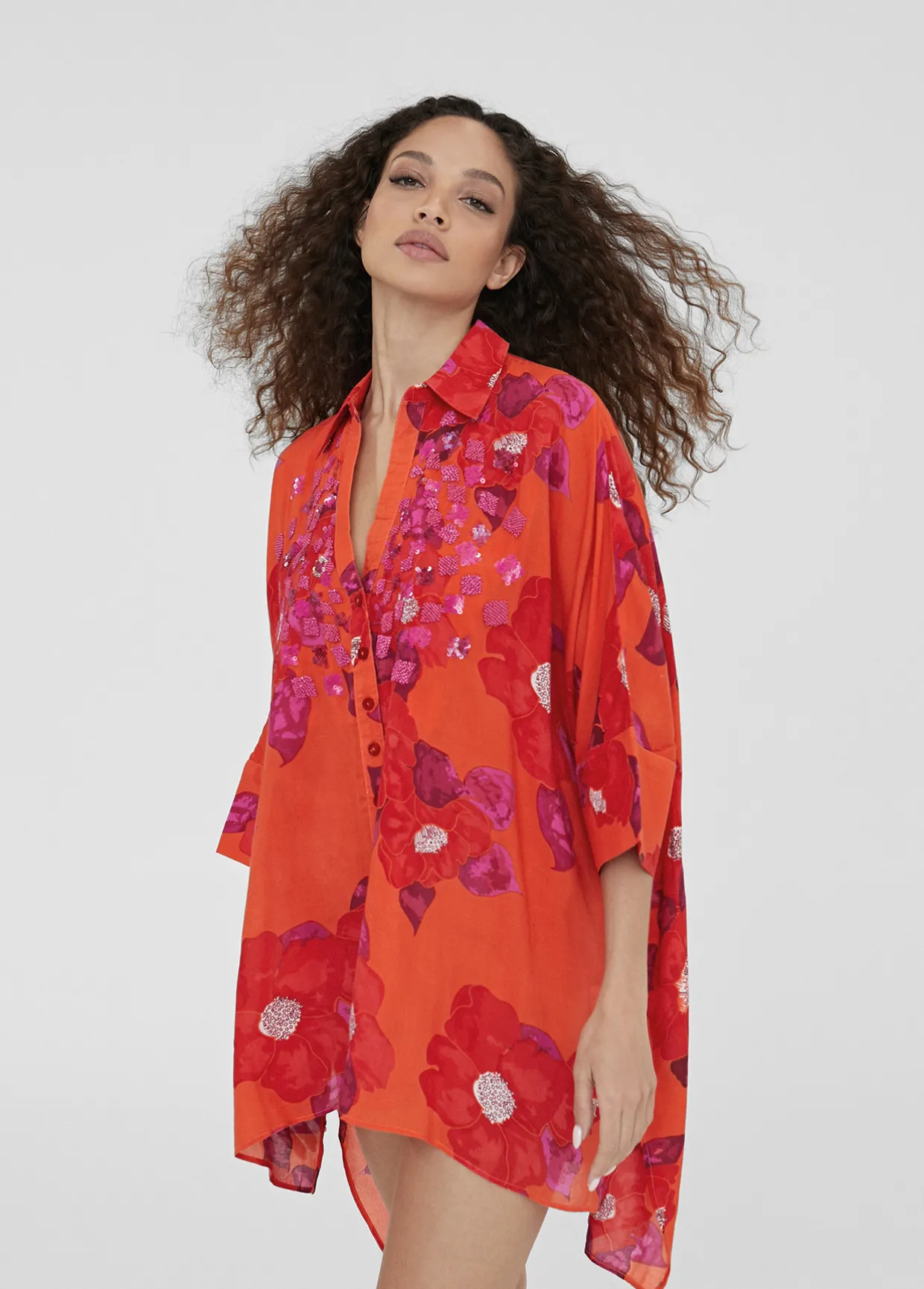 Camisola oversize en estampado floral. Cuello camisero. Abrochada con botones en frontal bordado y media manga. Bajo asimétrico.