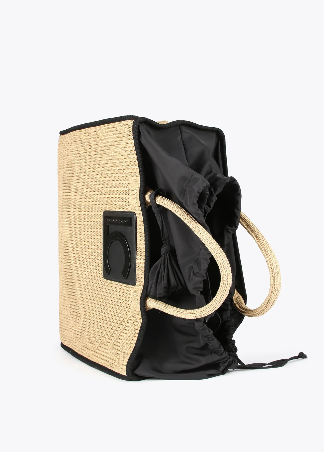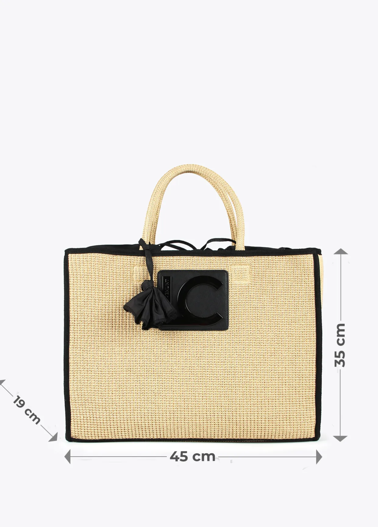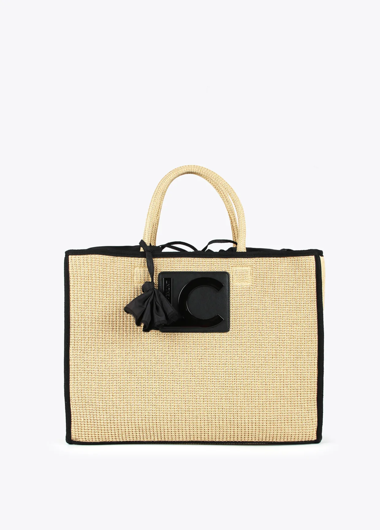 Bolso tipo capazo en efecto ráfia y detalles en efecto piel. Ribetes a contraste y logotipo lacado en parte frontal. Bolsa interior protectora con cierre de cordón y detalle pompon extraíble.