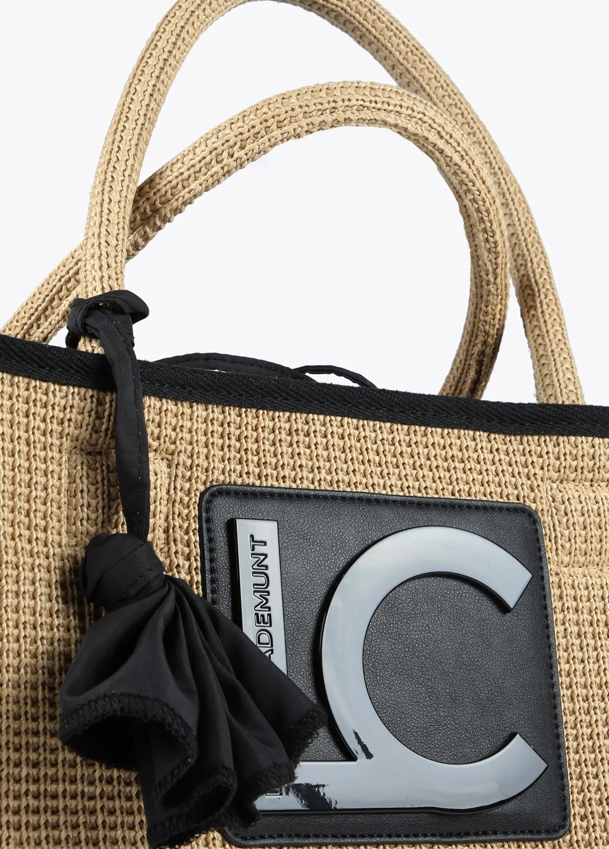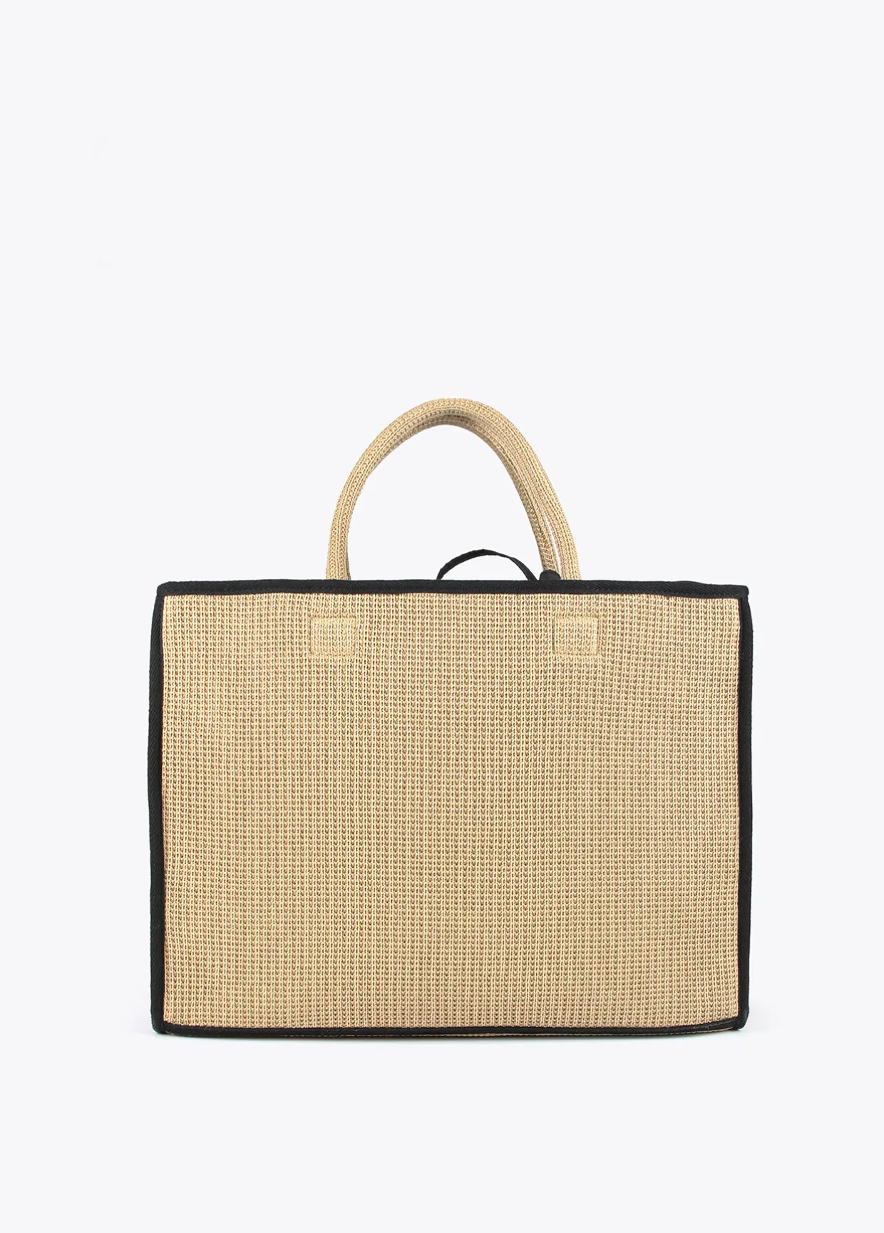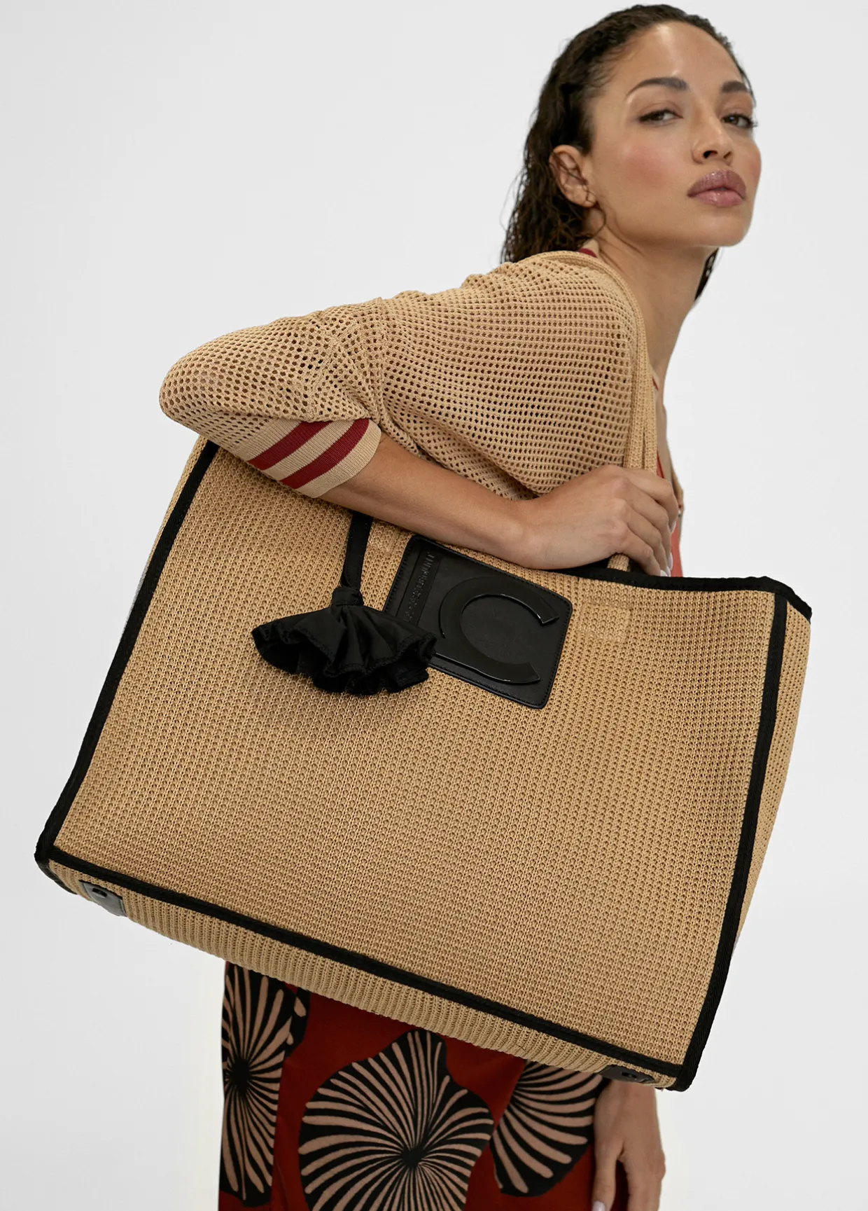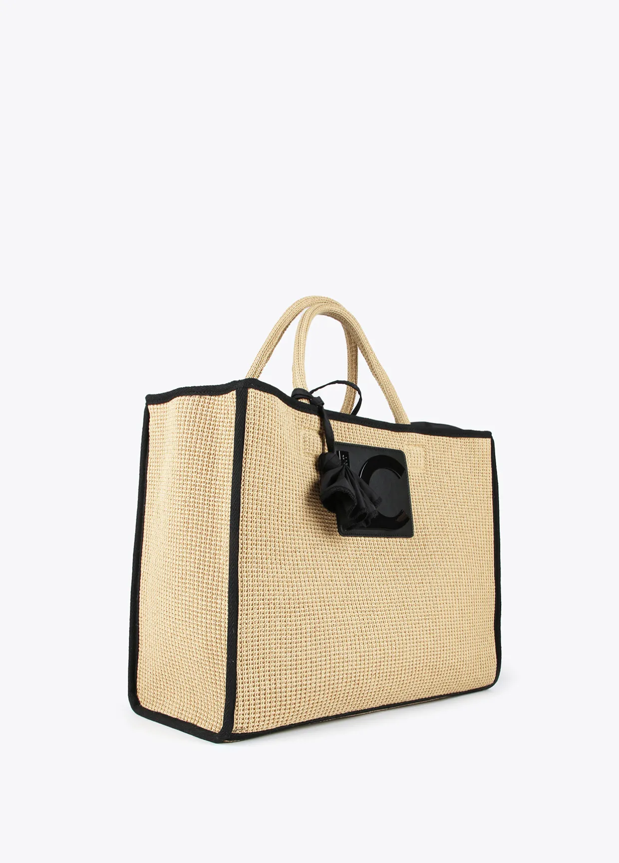 Bolso tipo capazo en efecto ráfia y detalles en efecto piel. Ribetes a contraste y logotipo lacado en parte frontal. Bolsa interior protectora con cierre de cordón y detalle pompon extraíble.