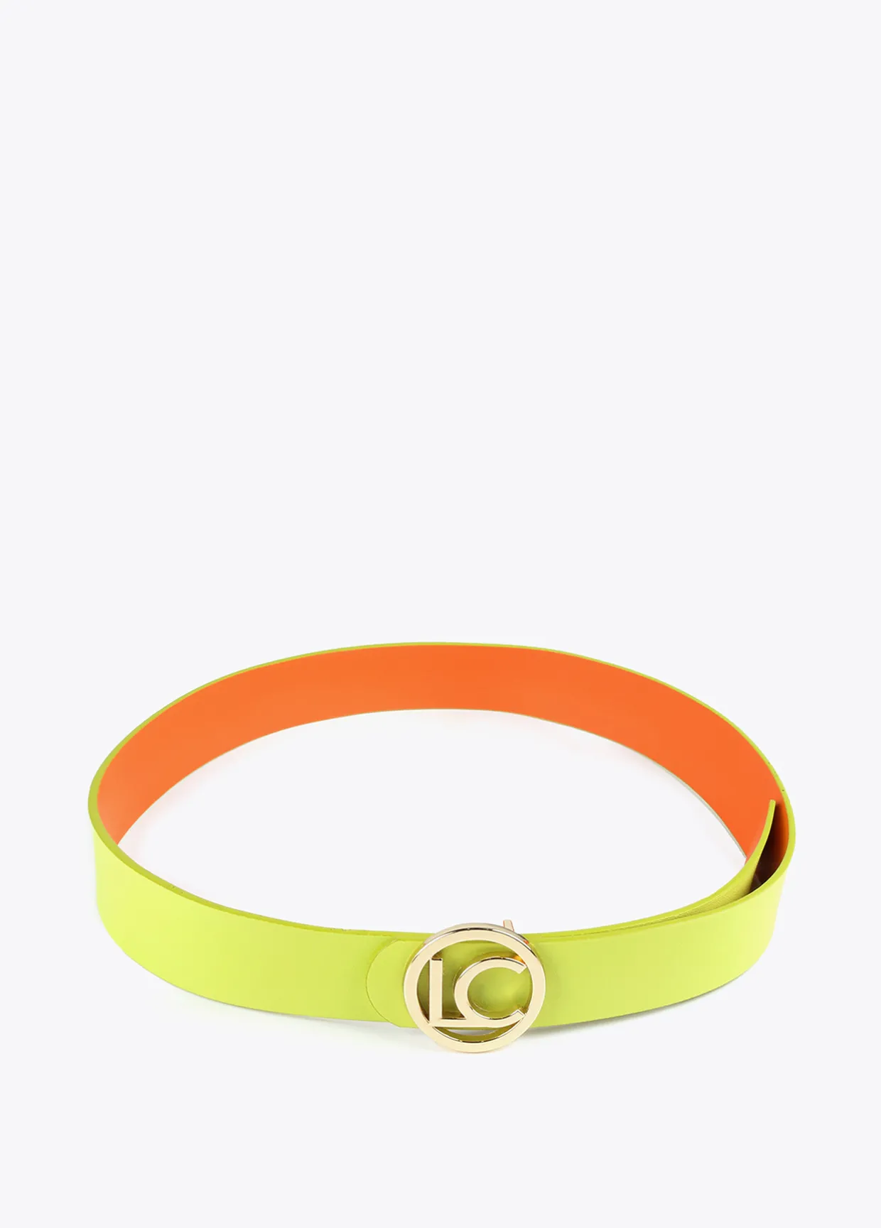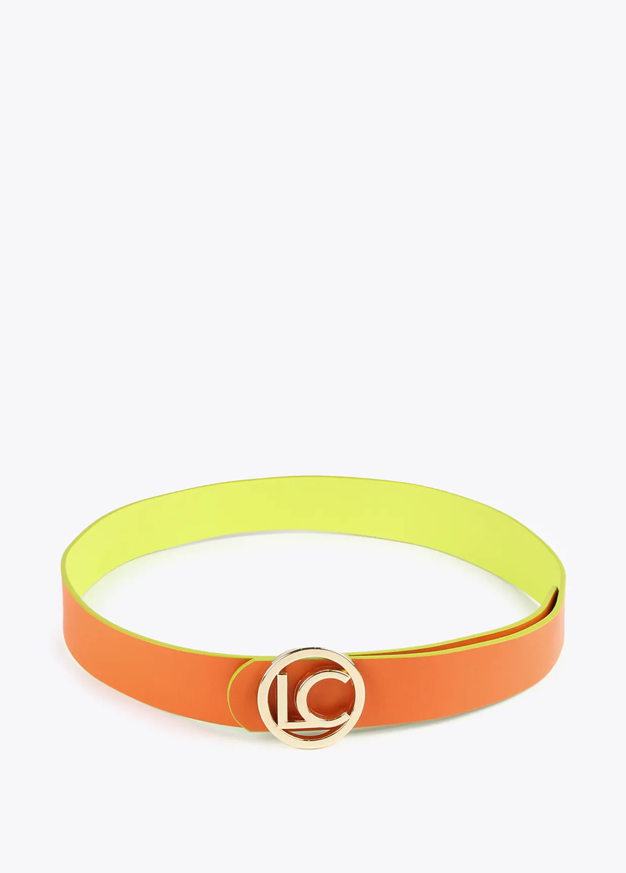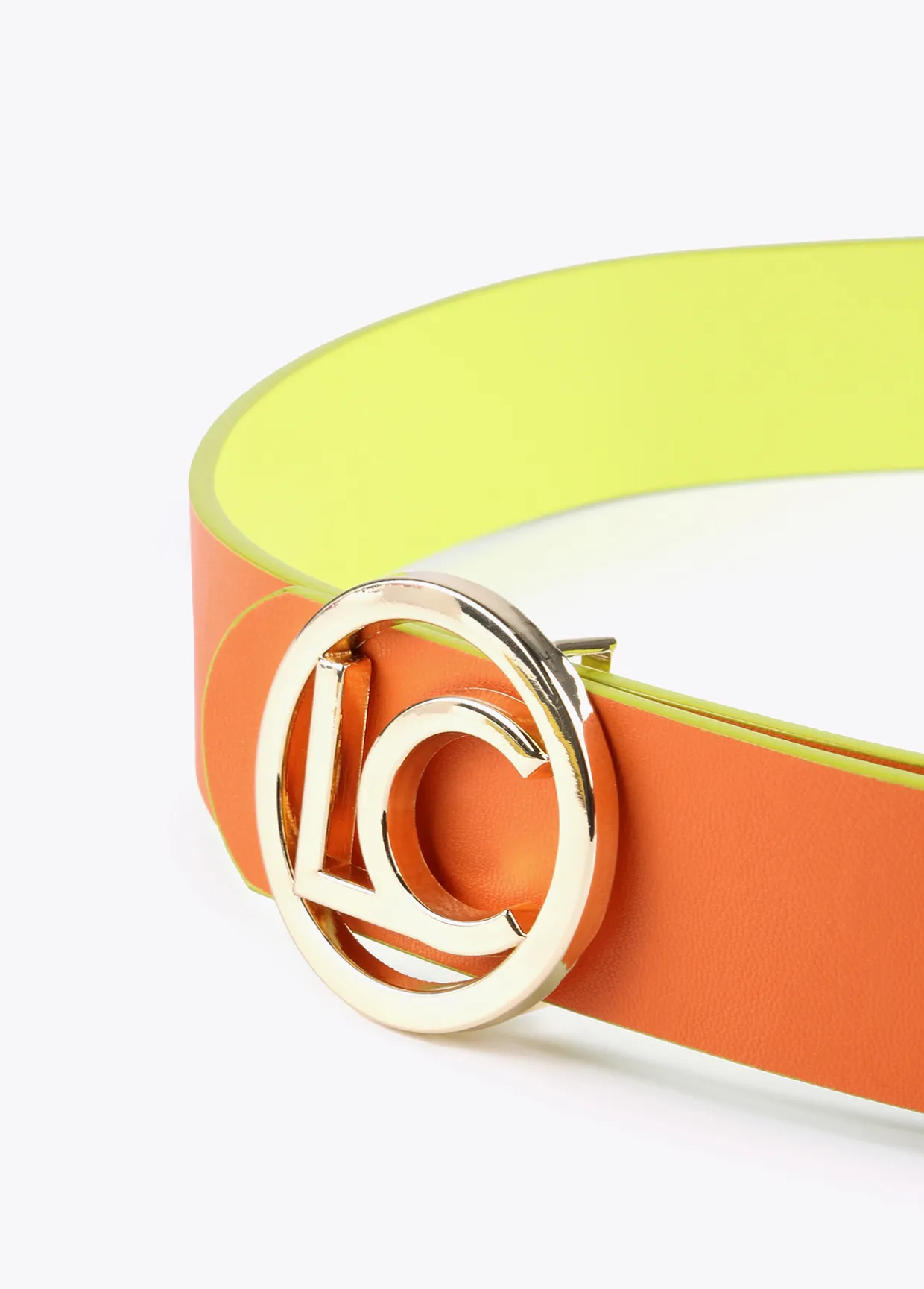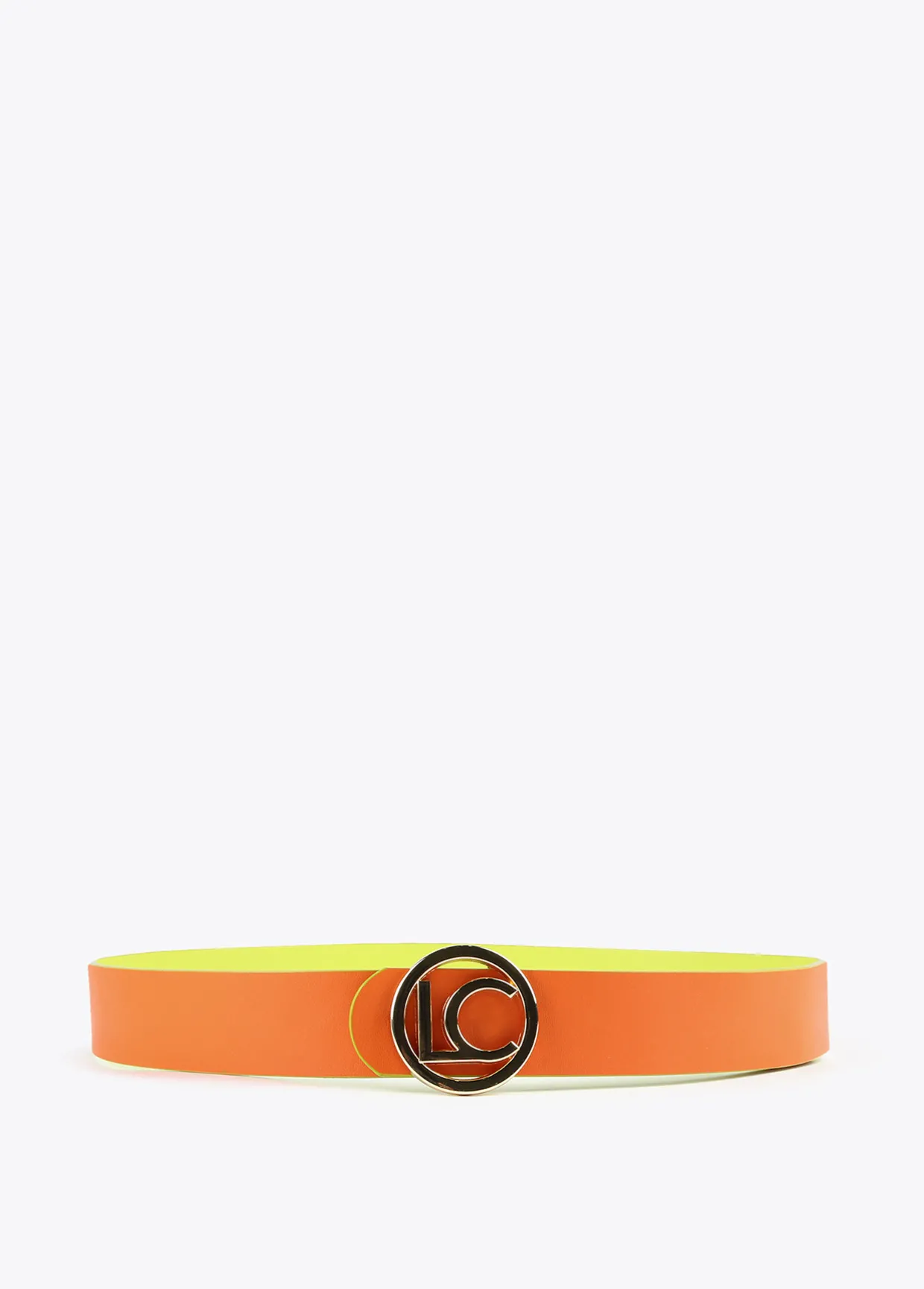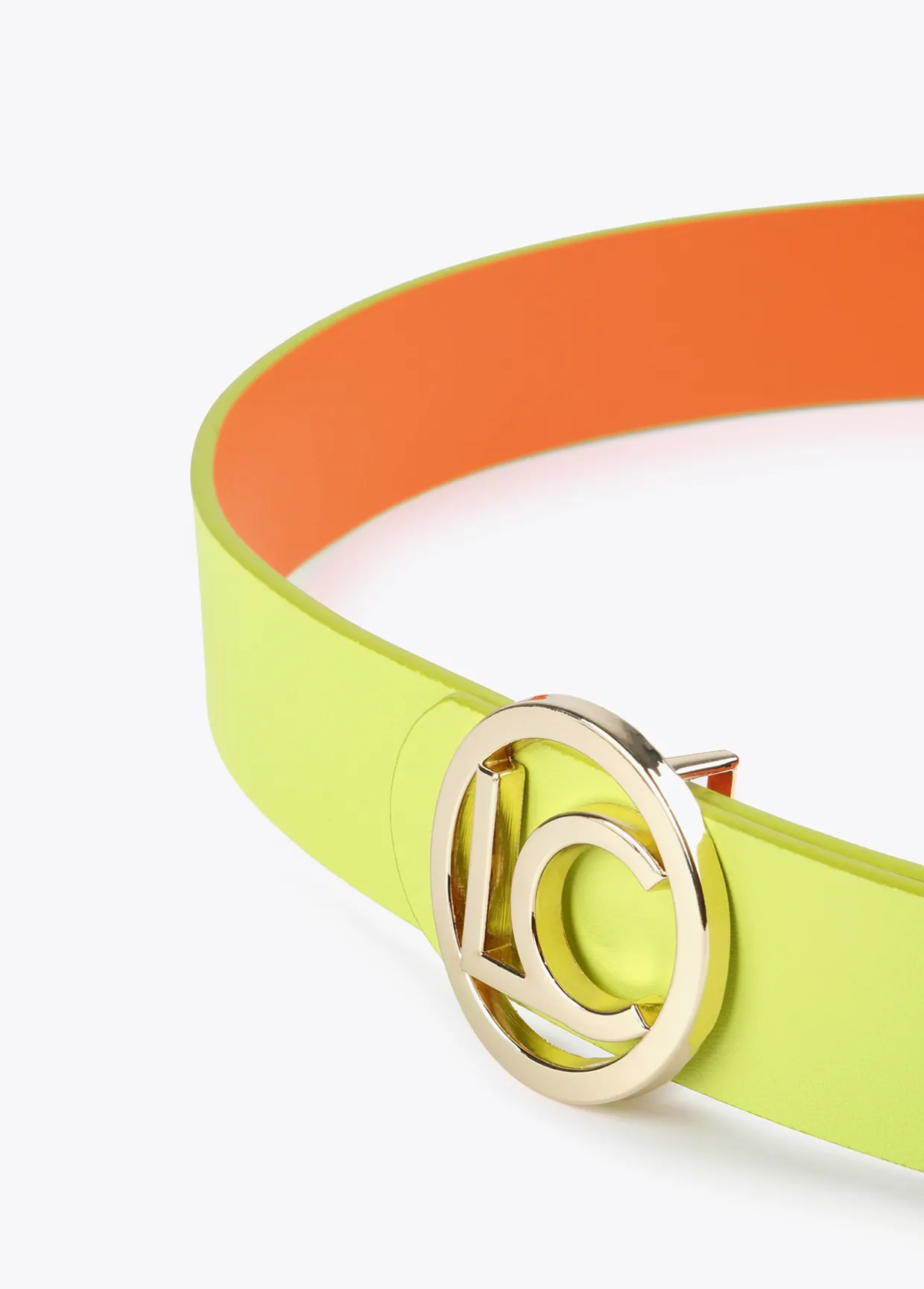 Cinturón reversible en efecto piel con hebilla y logo redondos y dorados.