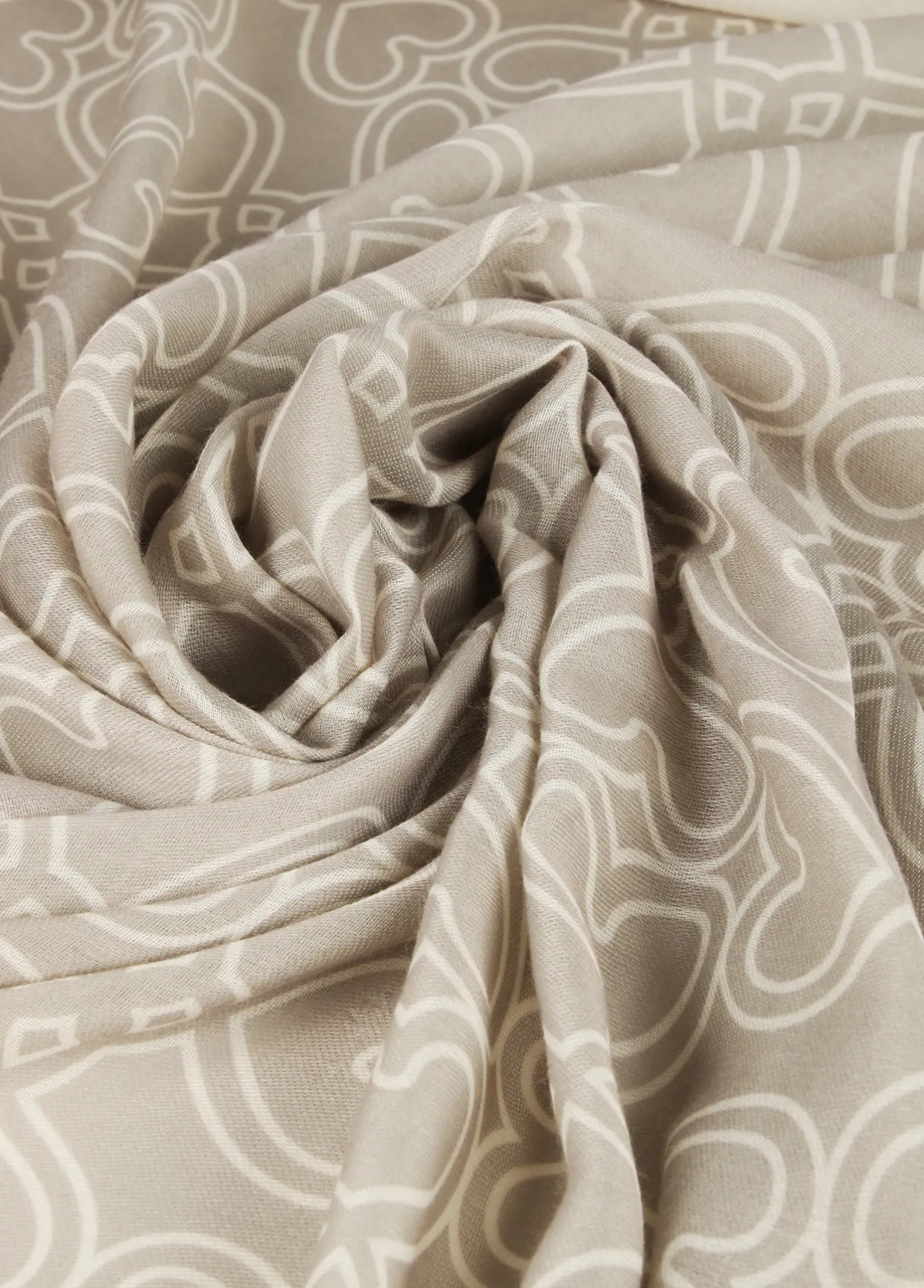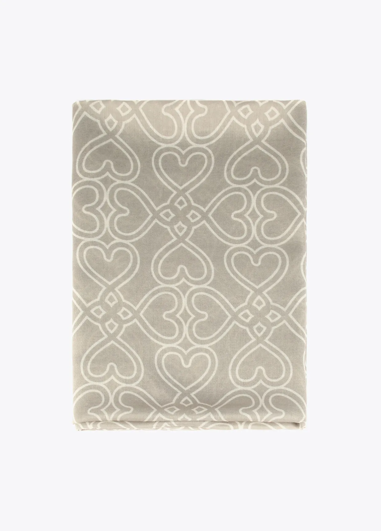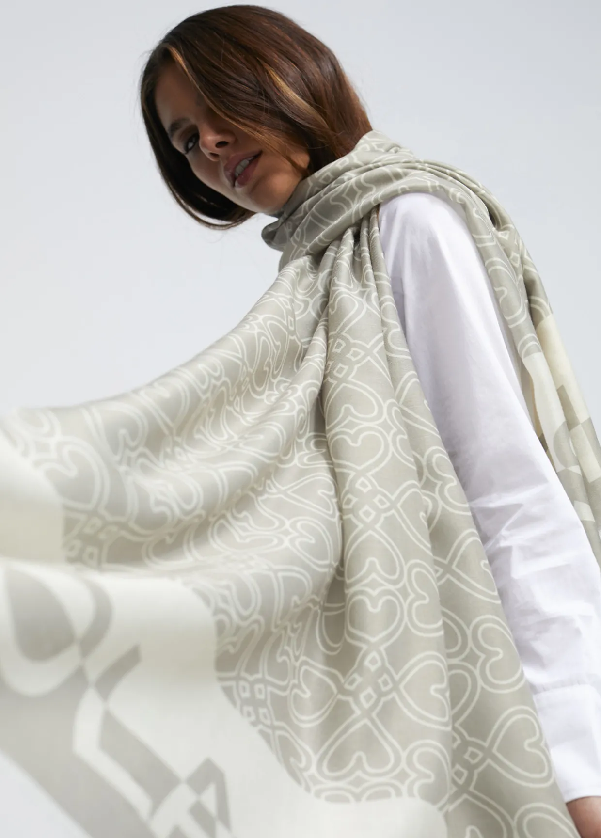 Fular en tonos crudos logotipado y con estampado corazones infinitos.