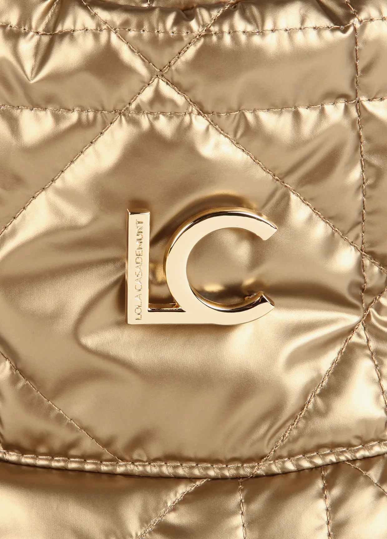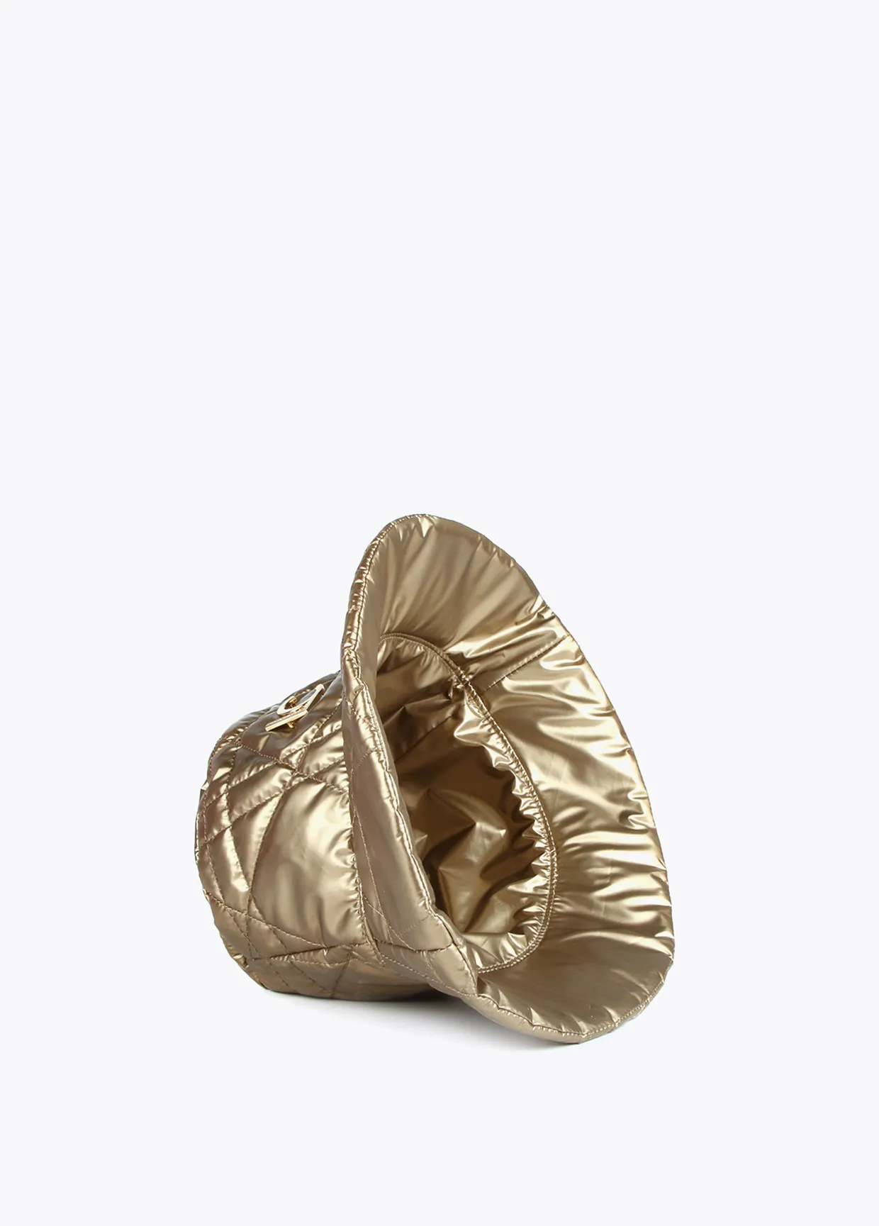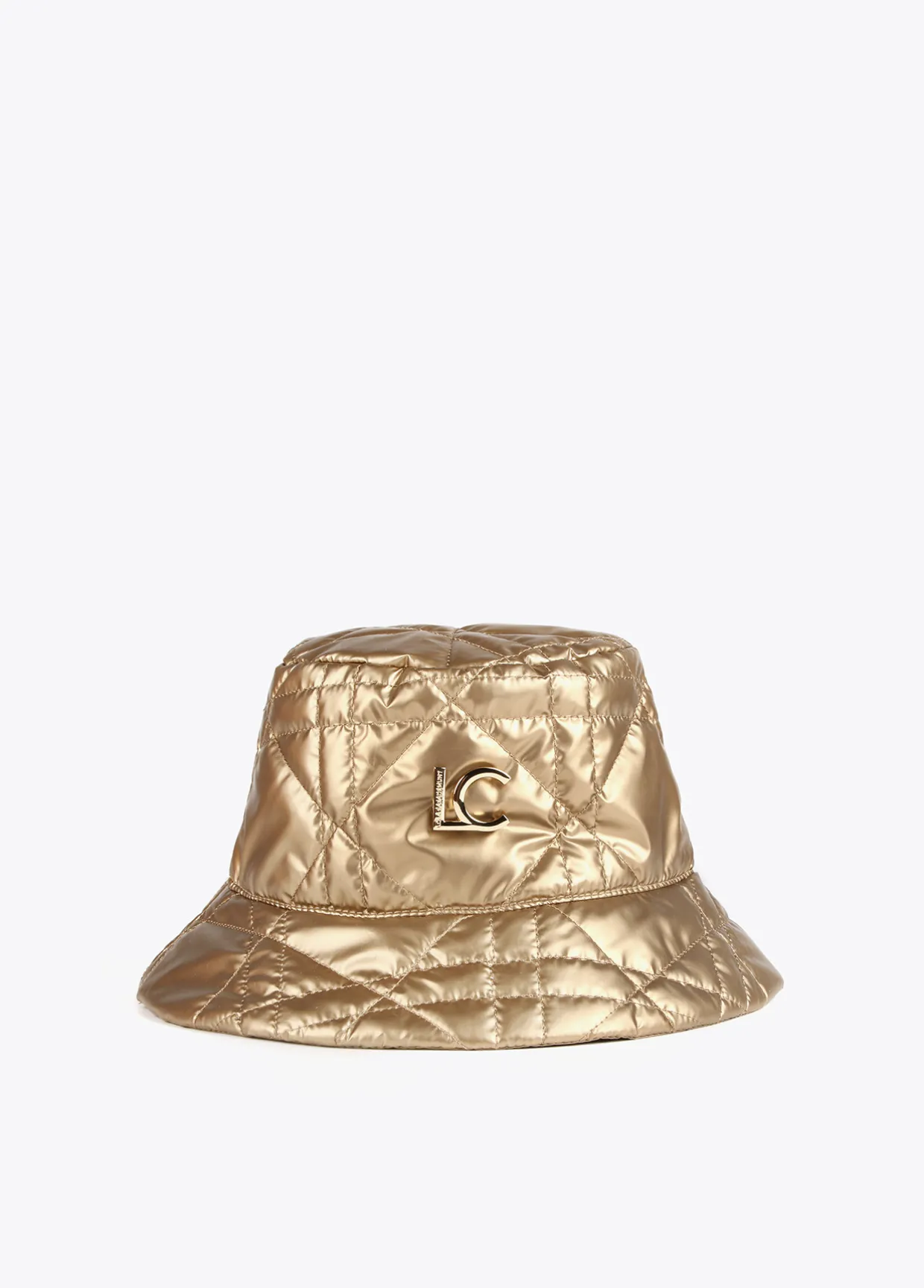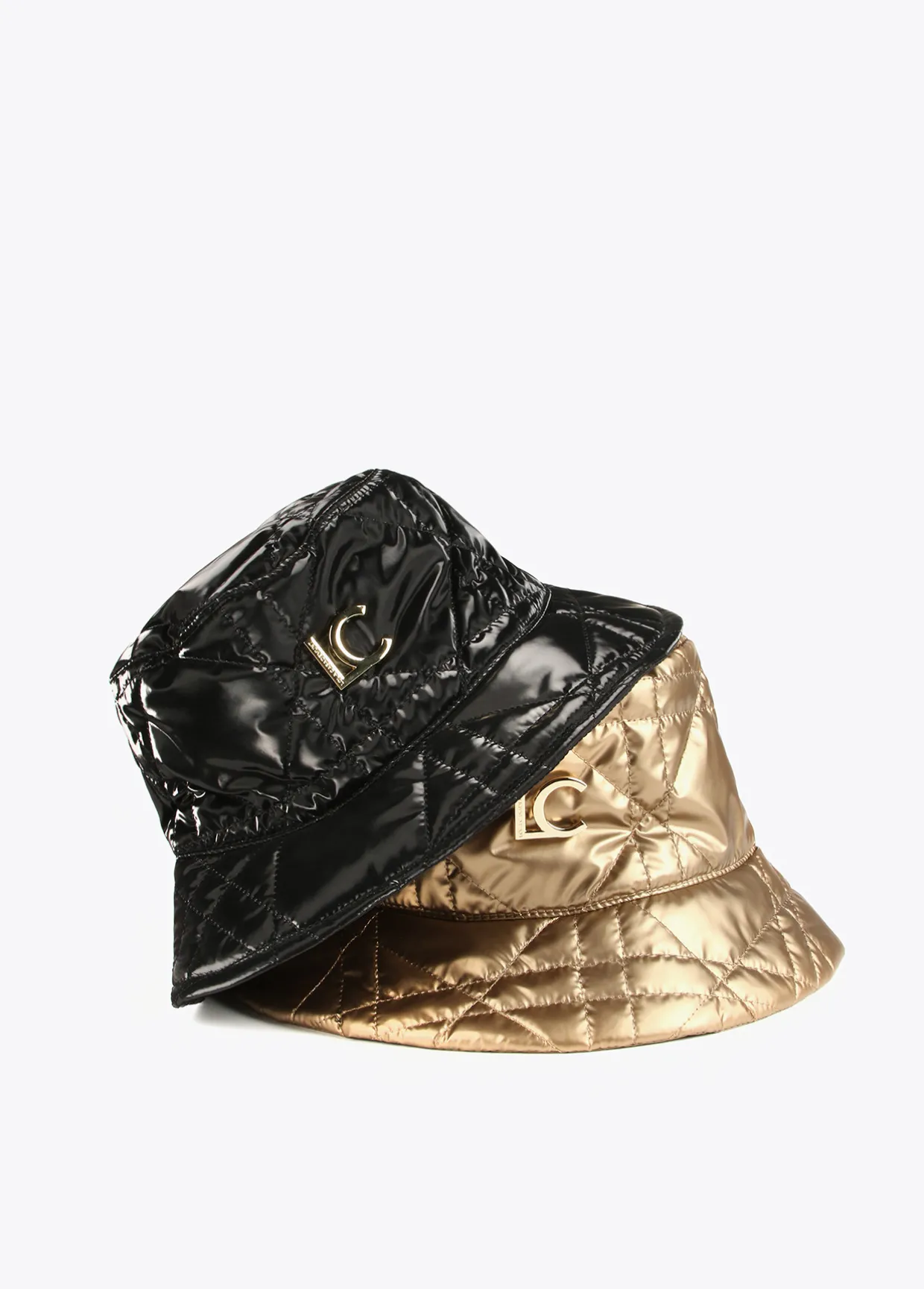 Gorro tipo bucket acolchado en nylon brillante y logo dorado en parte frontal.