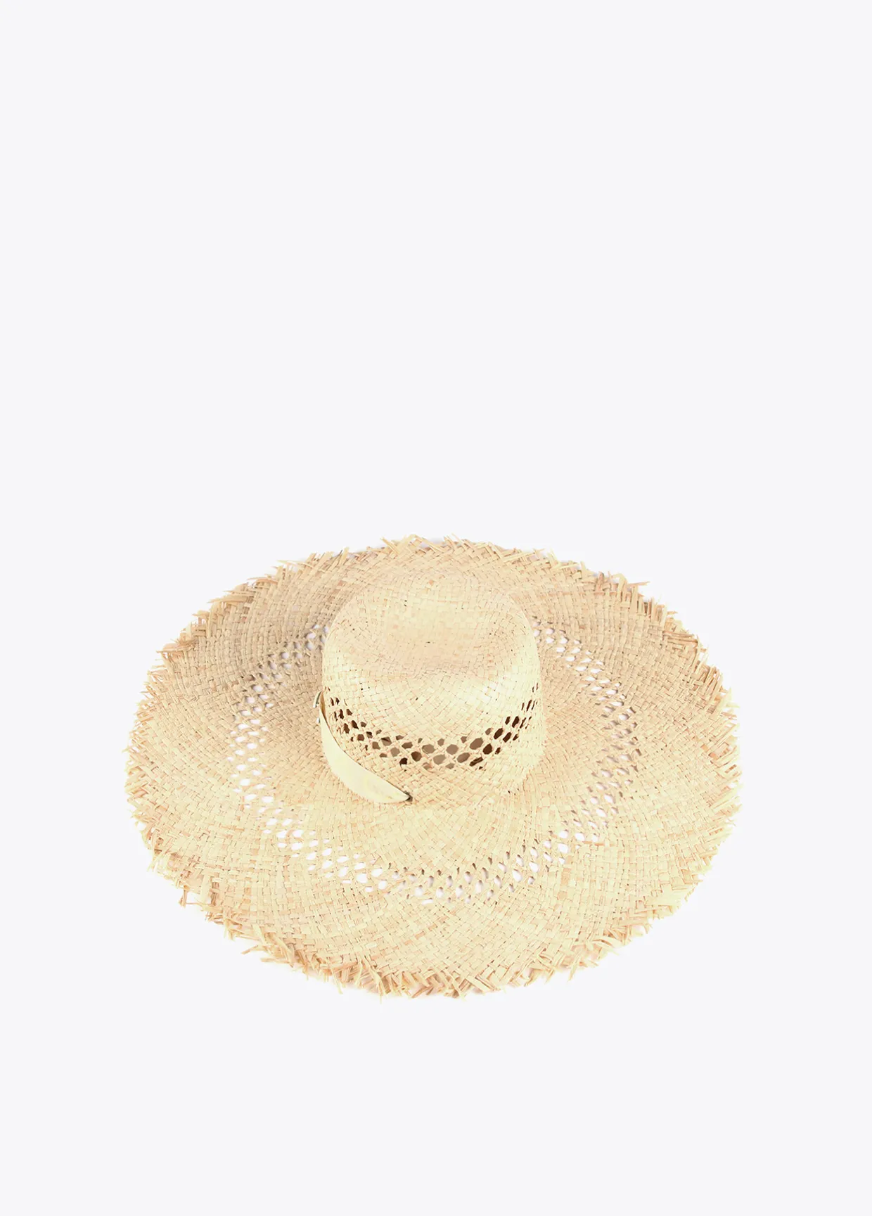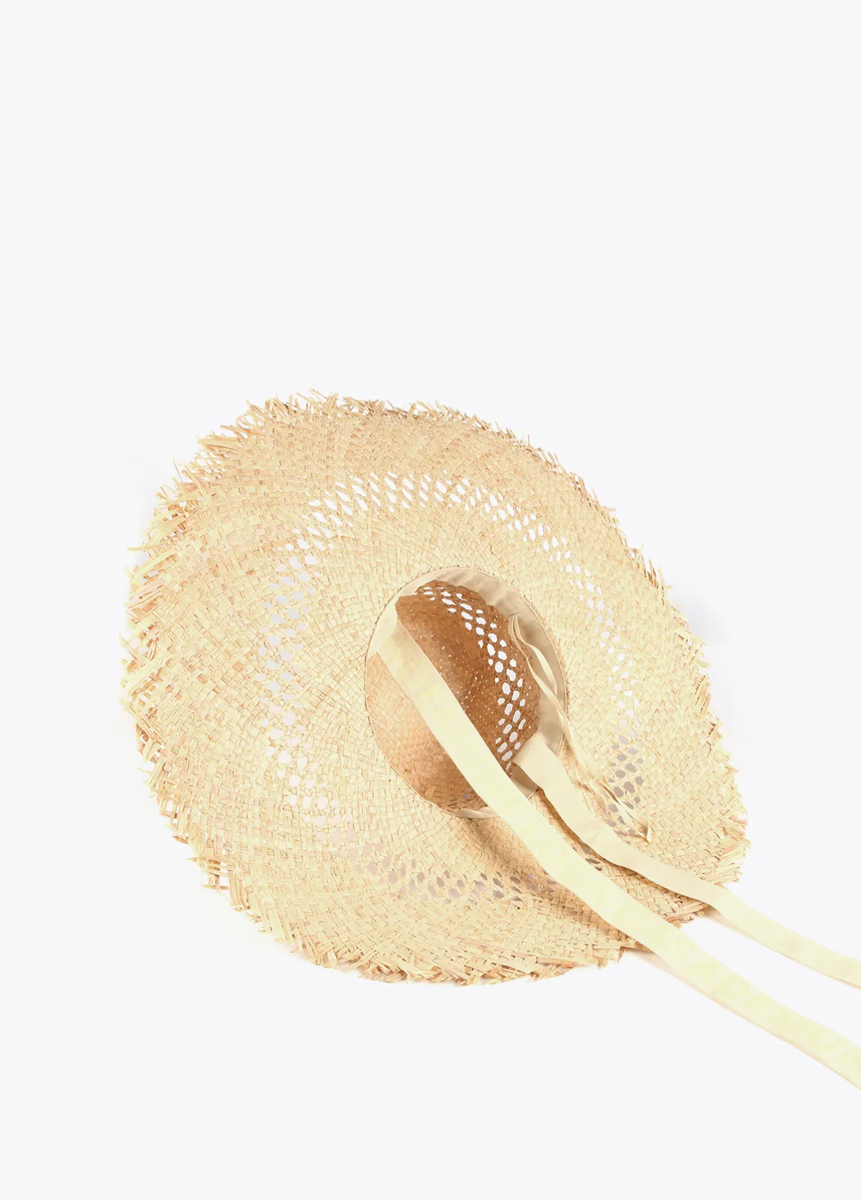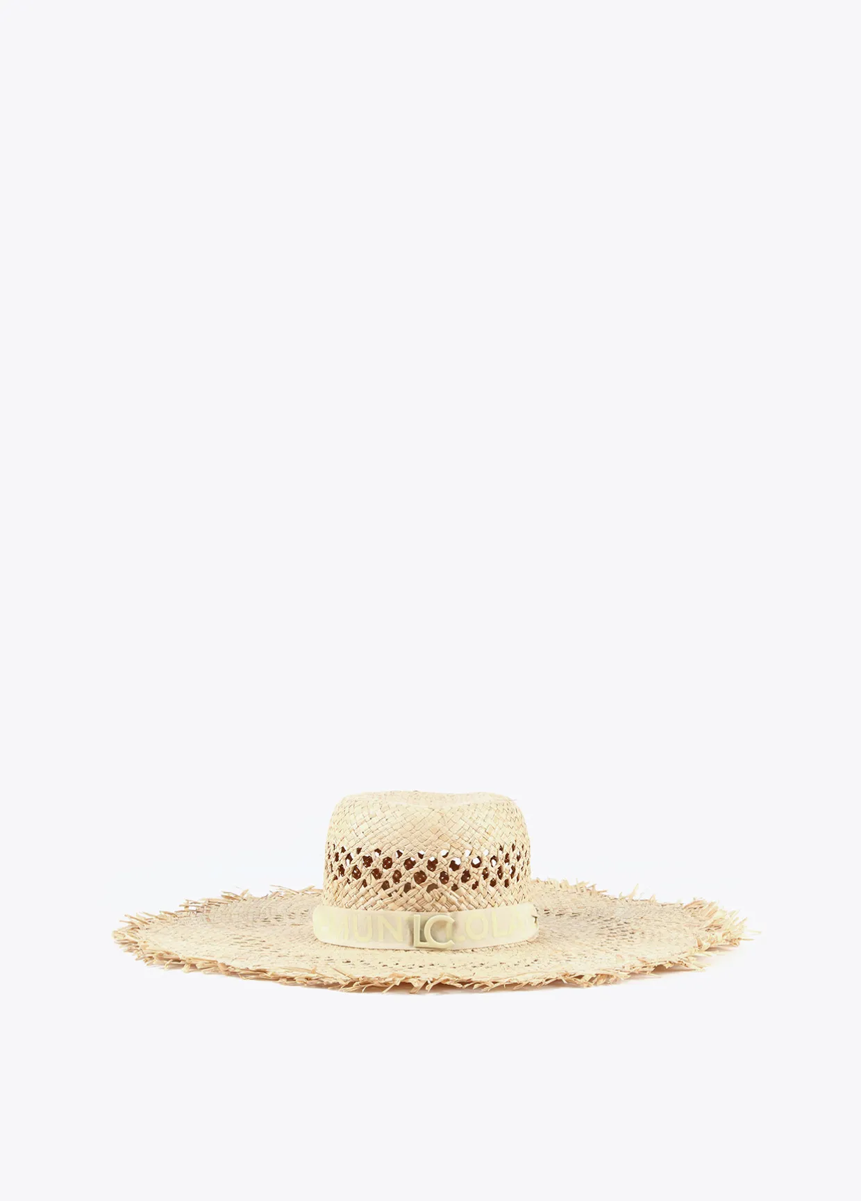 Pamela efecto ráfia monocolor con logo lacado al tono en parte frontal y flecos . Cintas logotipadas a modo de sujeción.
