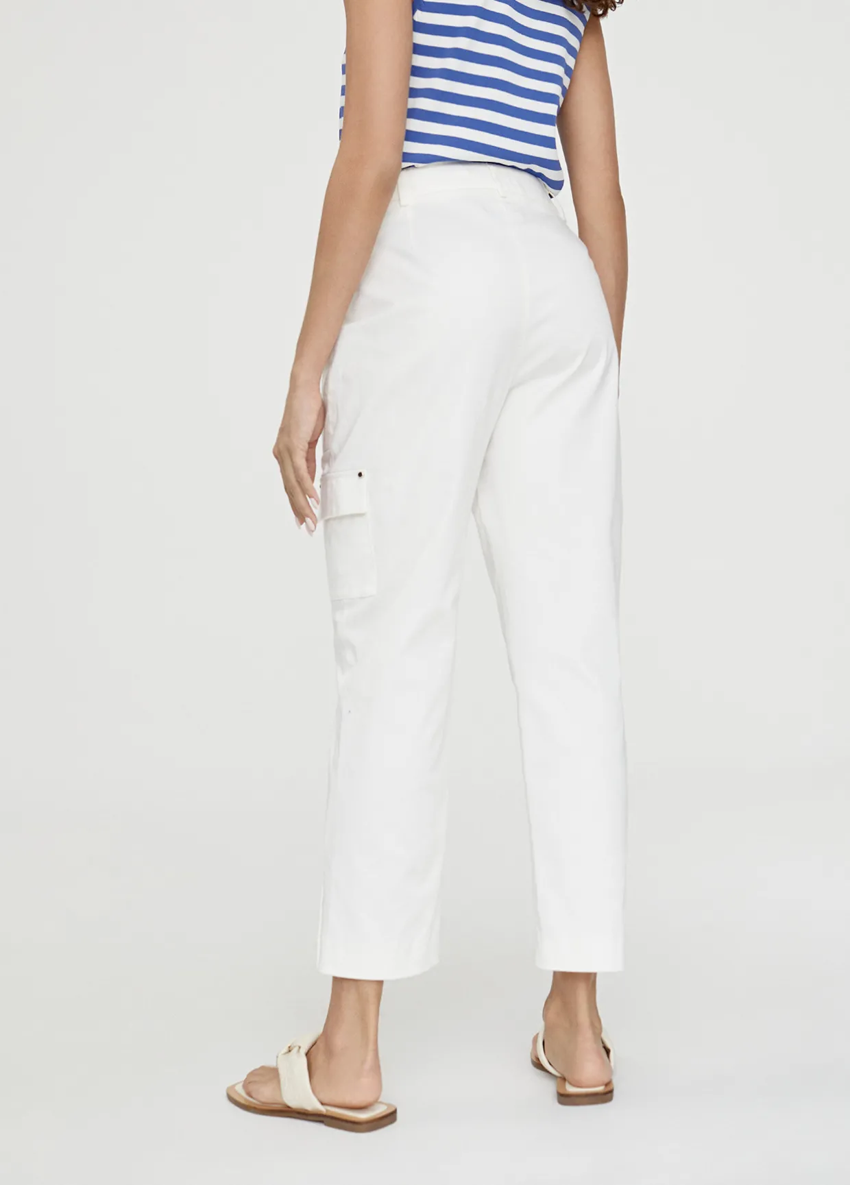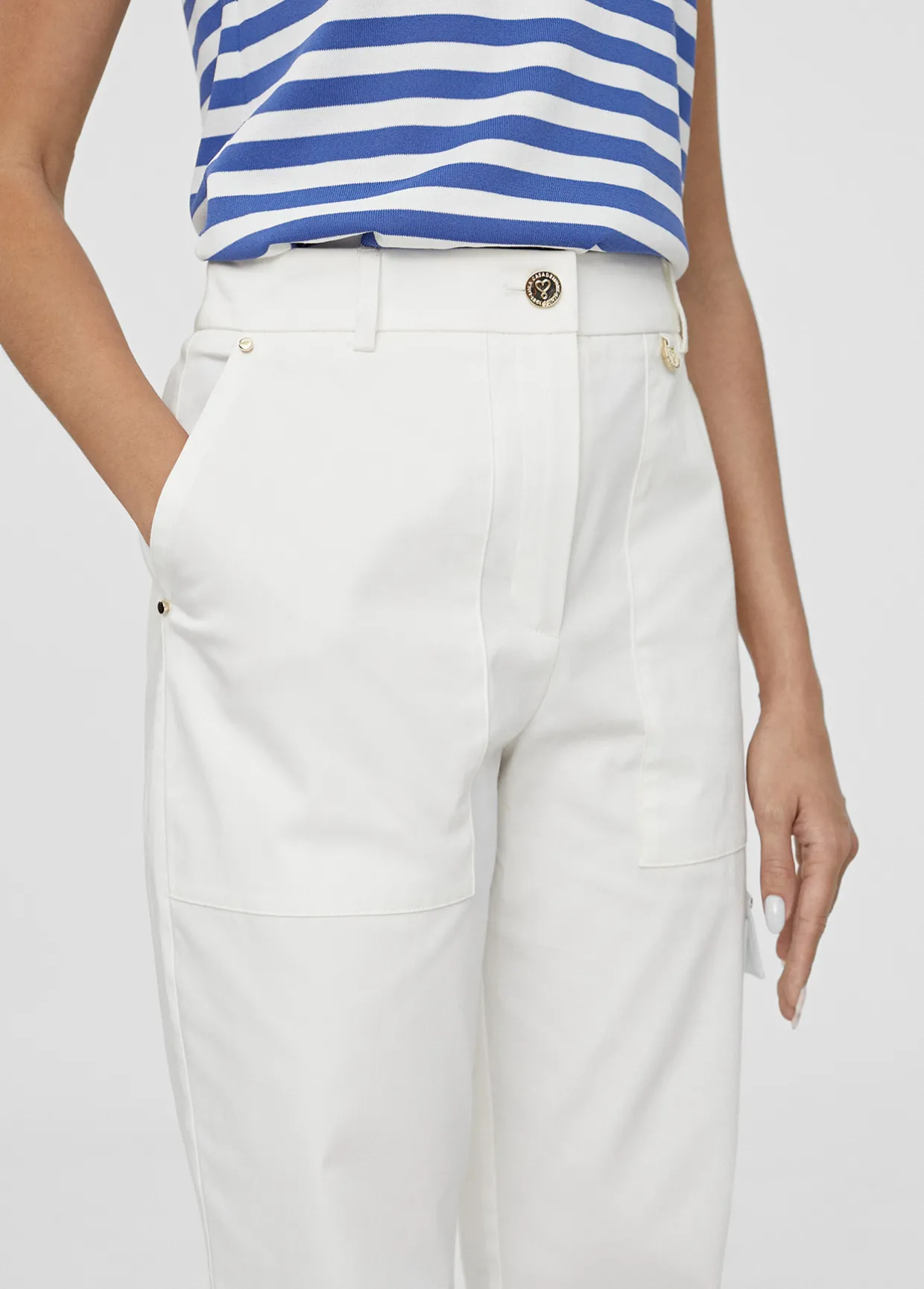 Pantalón de largo tobillero. Bolsillos laterales y cerrado con cremallera frontal y botón dorado. Bolsillo plastrón con solapa en pernera lateral.