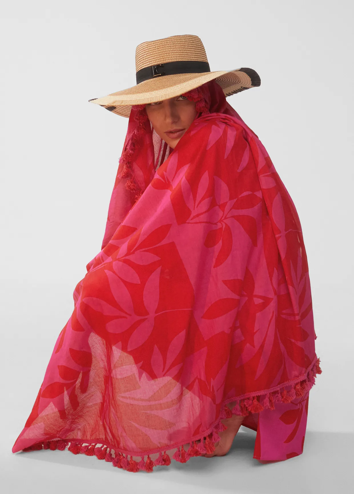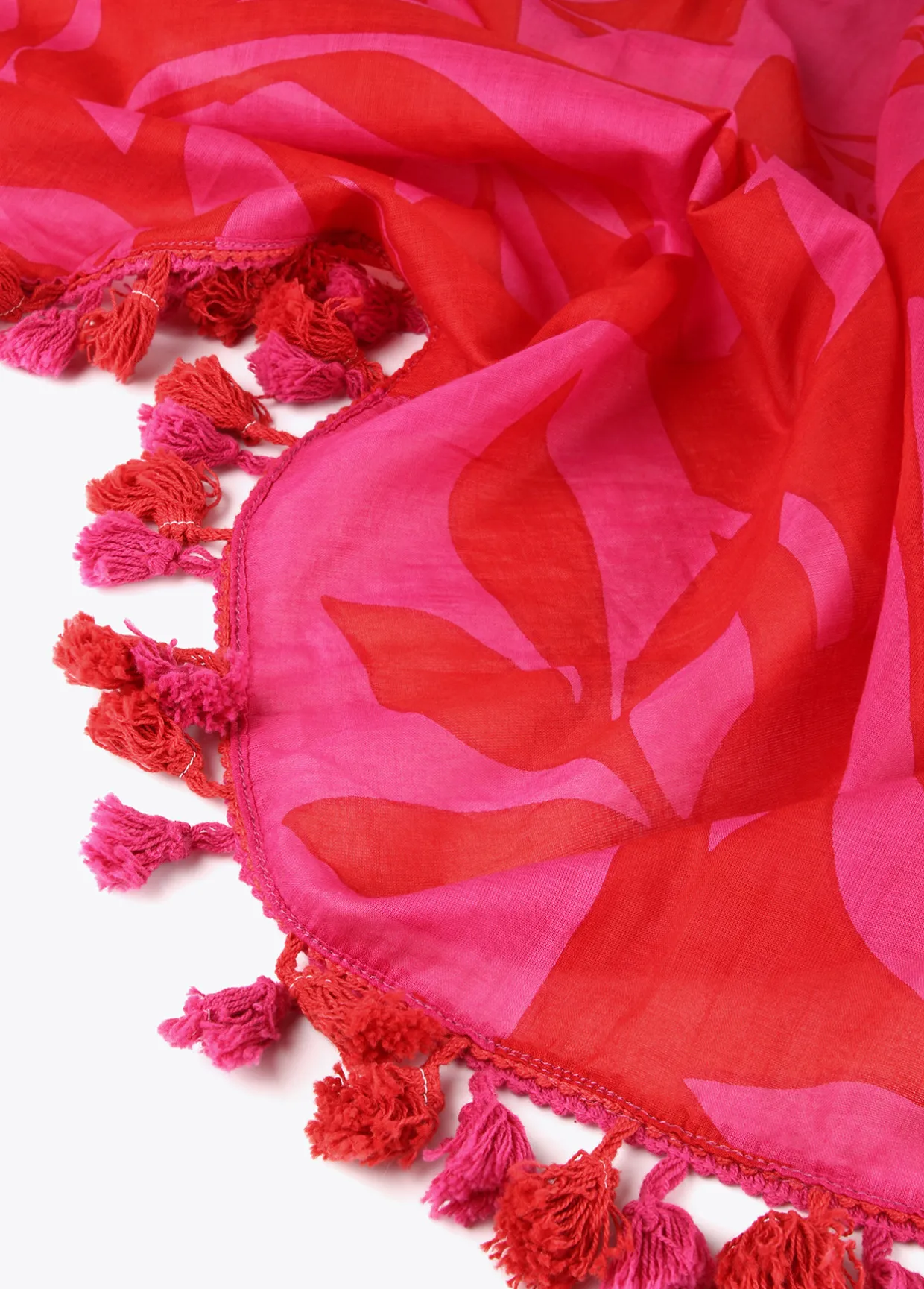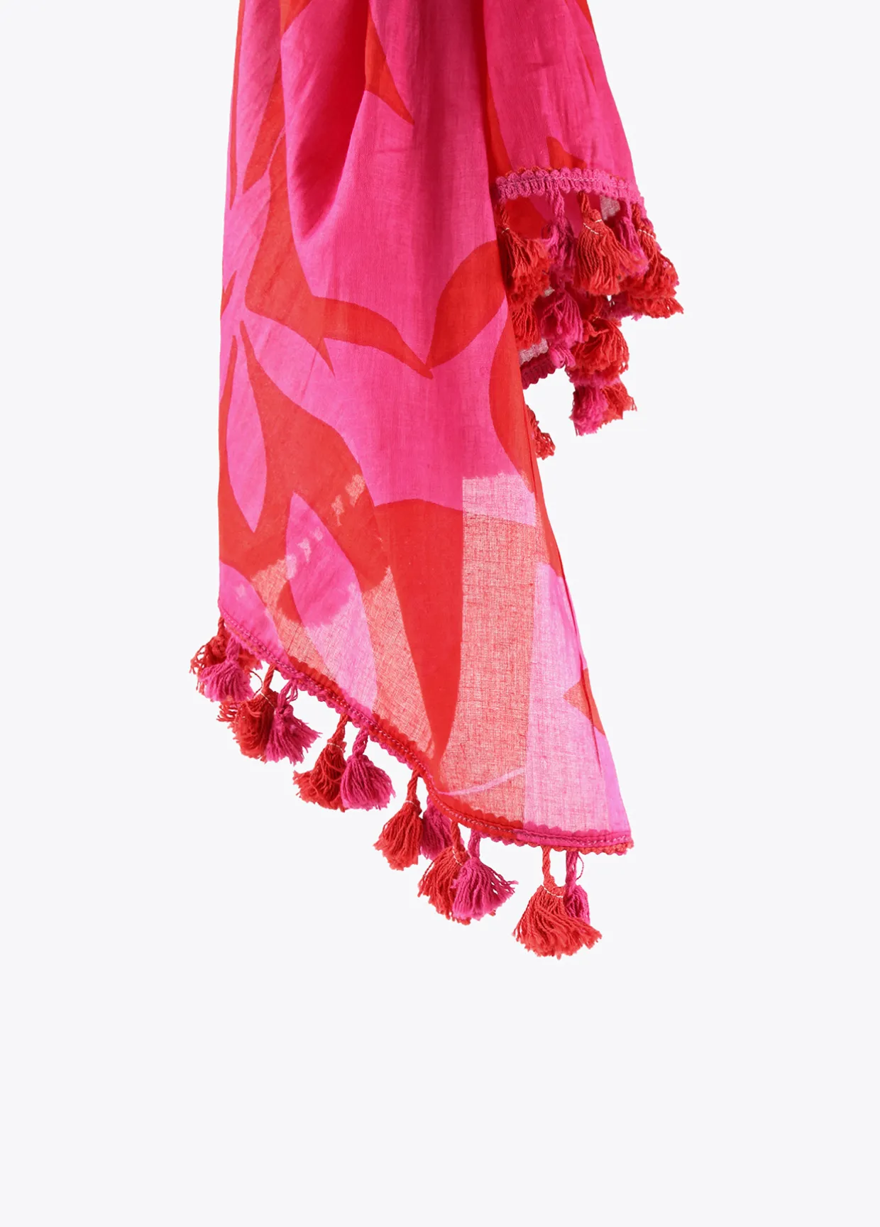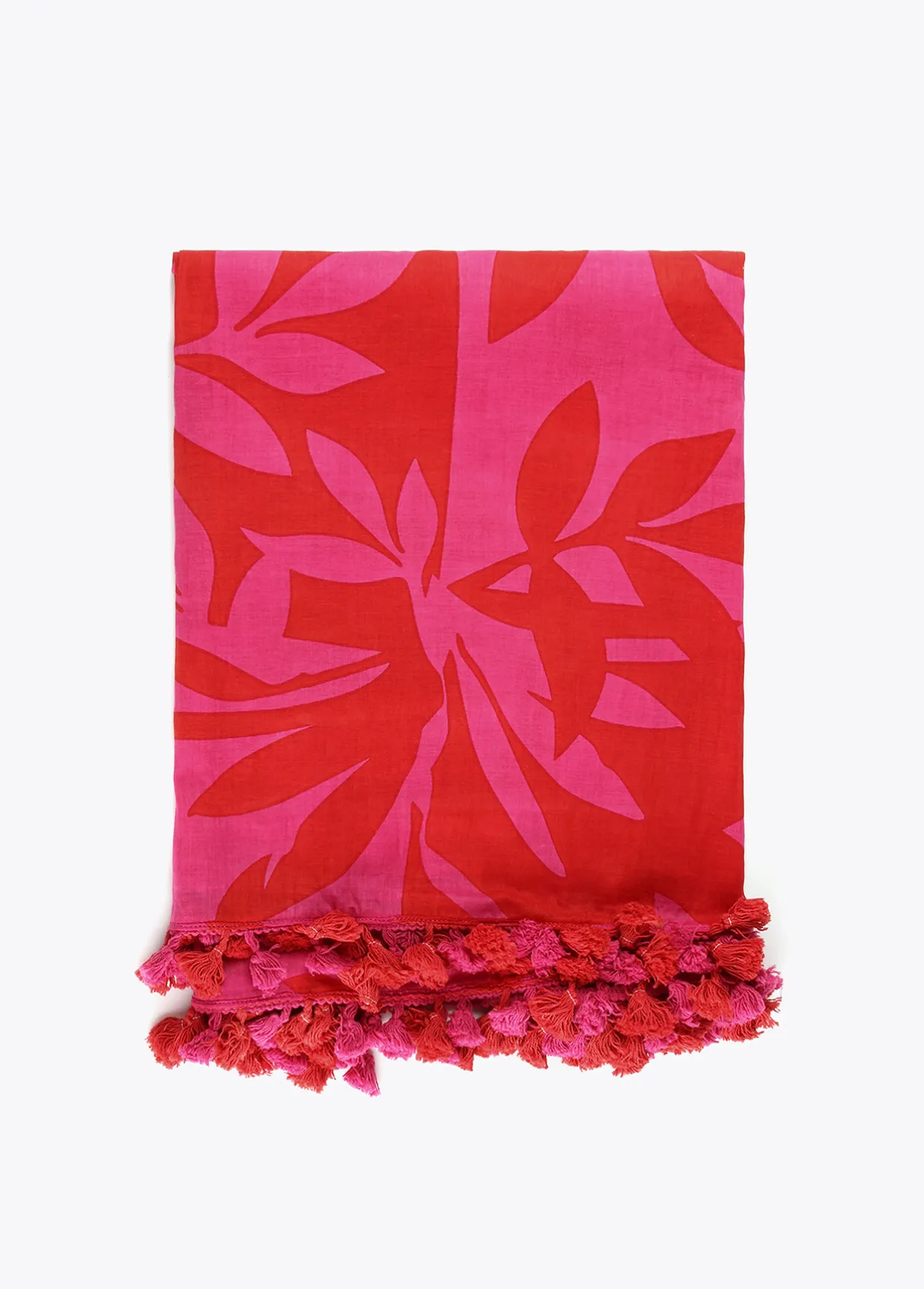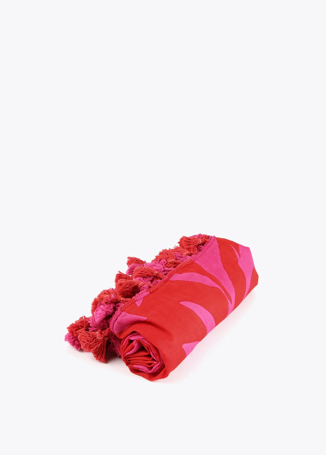 Pareo con estampado floral en tonos rojos y fucsia. Pompones los extremos.