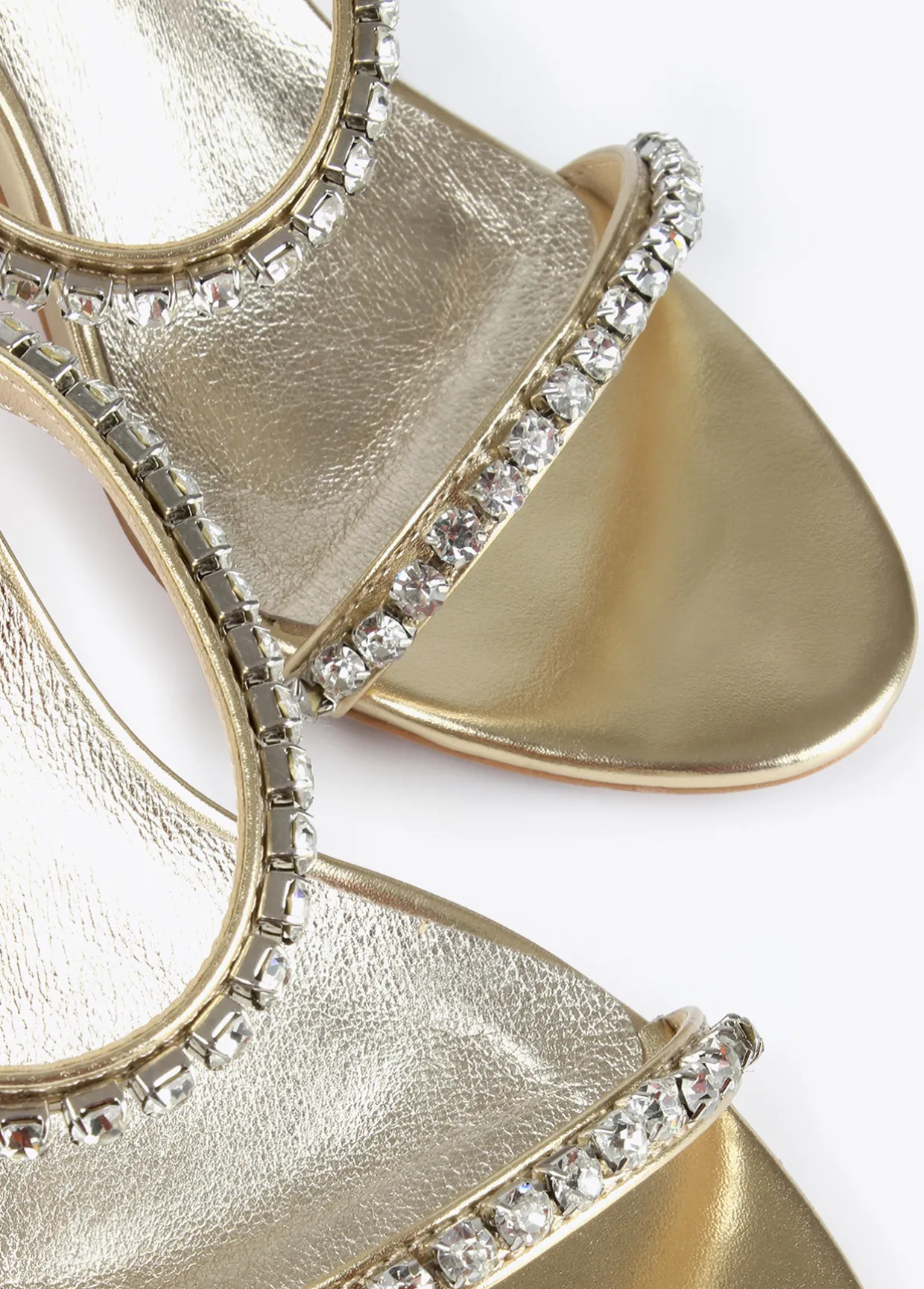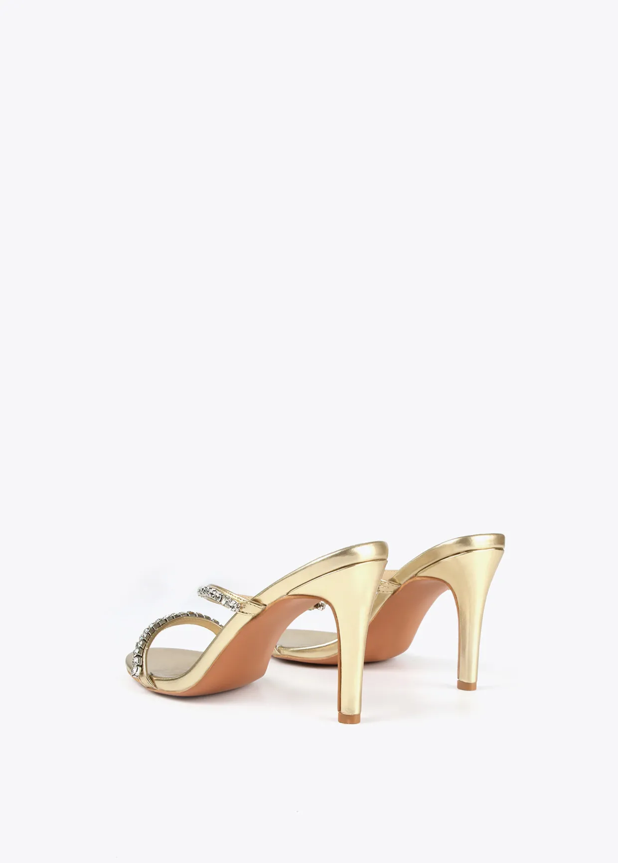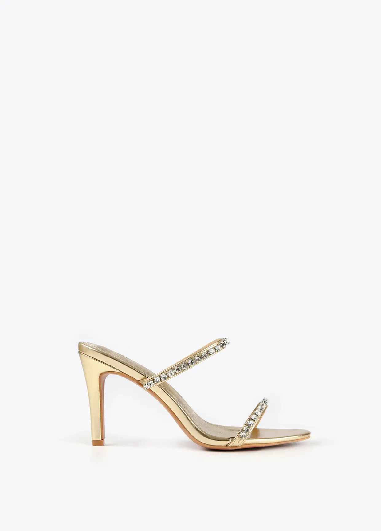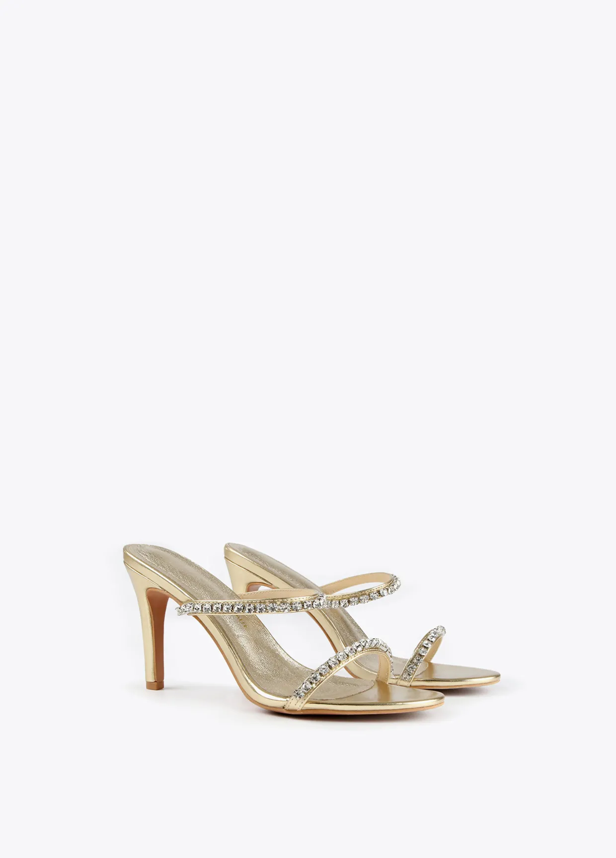 Sandalia de tacón medio con dos tiras y tira fruncida con detalle letra M dorada en su lateral. Plantilla logotipada.