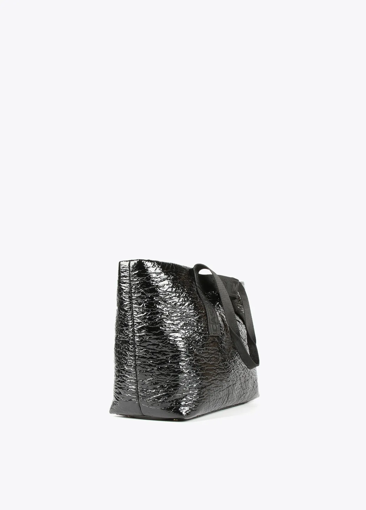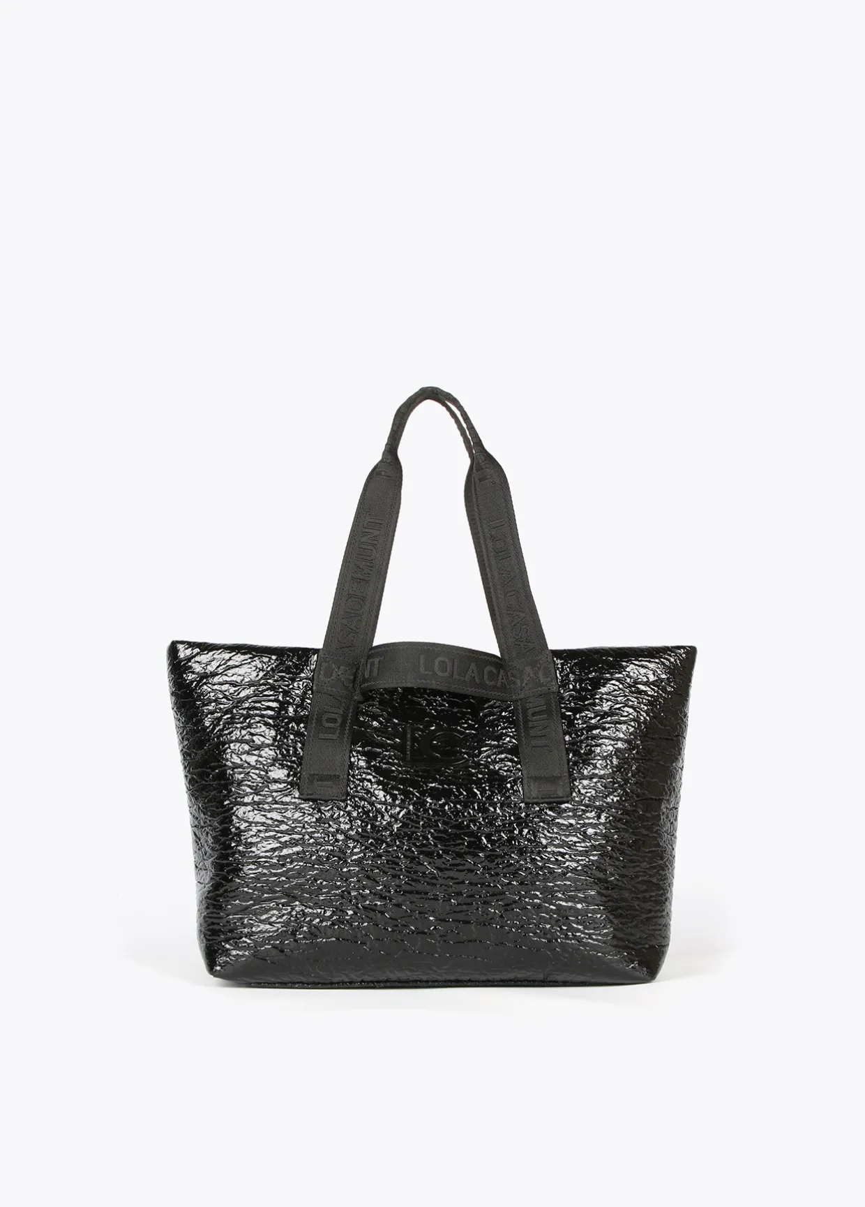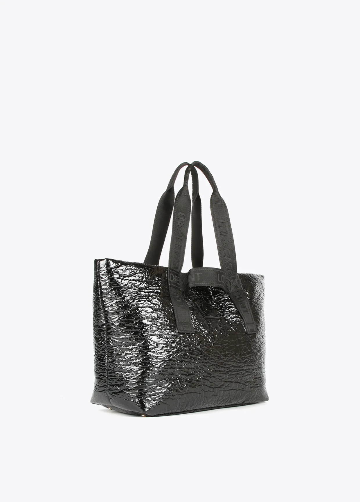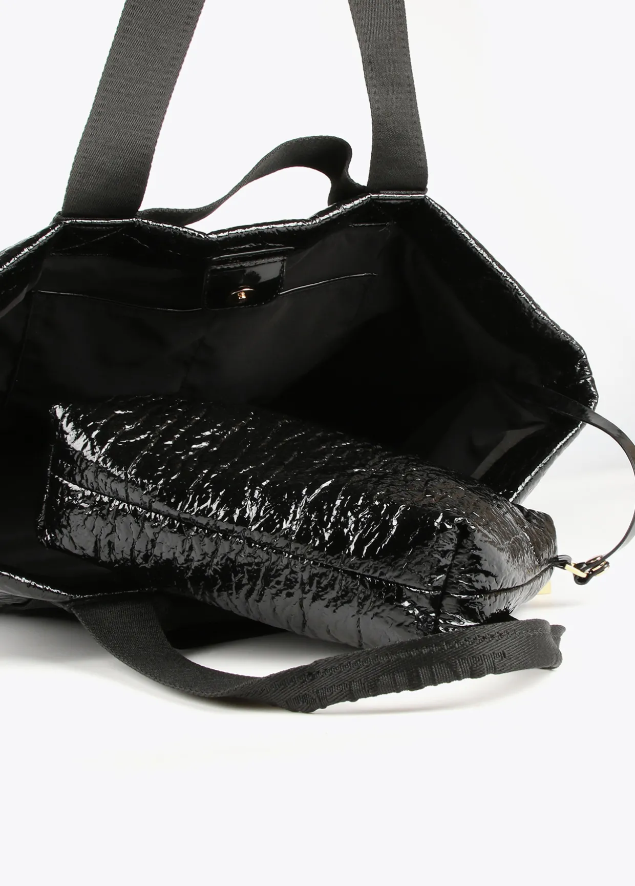 Bolso tipo shopper efecto charol arrugado con asas al tono logotipadas. Cierre con lengüeta y botón clic y detalle bolsito neceser interior.