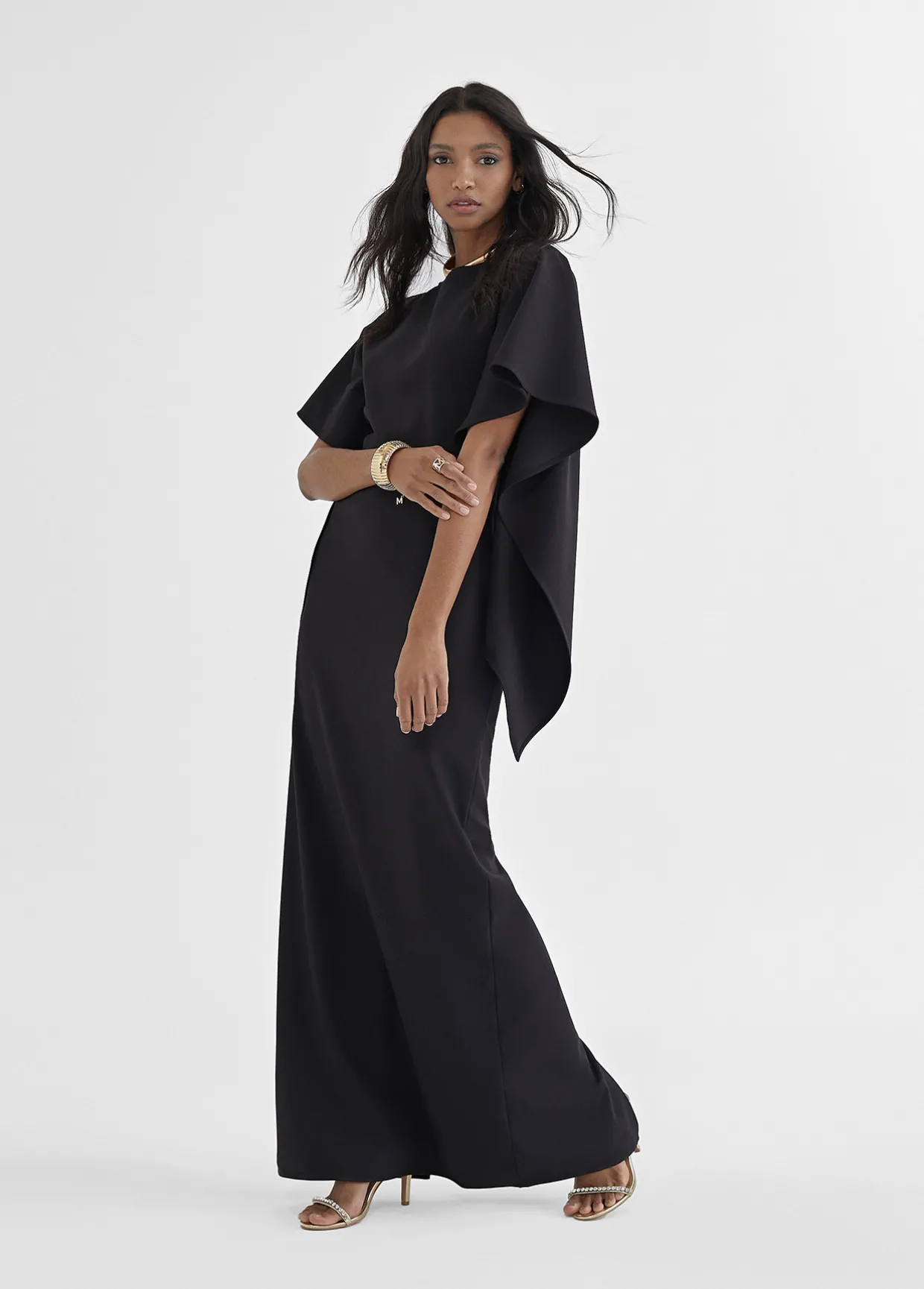 Vestido largo con mangas anchas efecto capa. Cuello caja. Espalda descubierta. Abertura en bajo falda trasera.