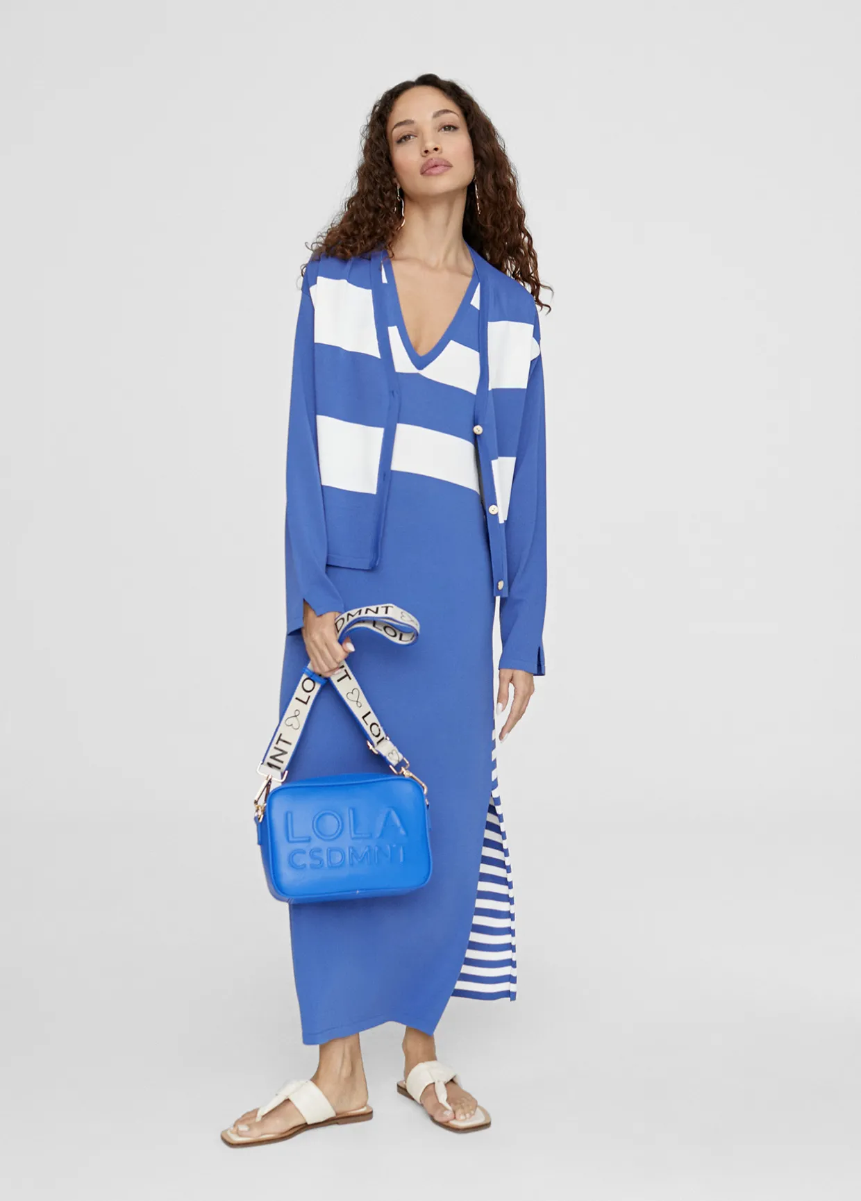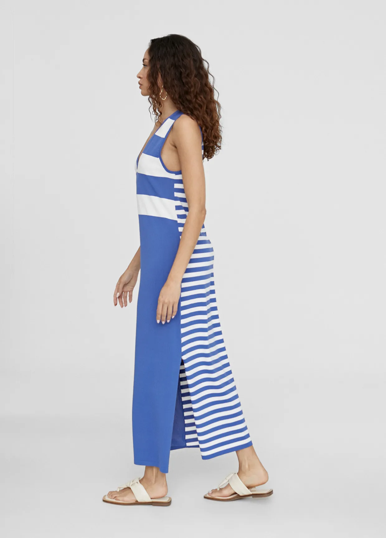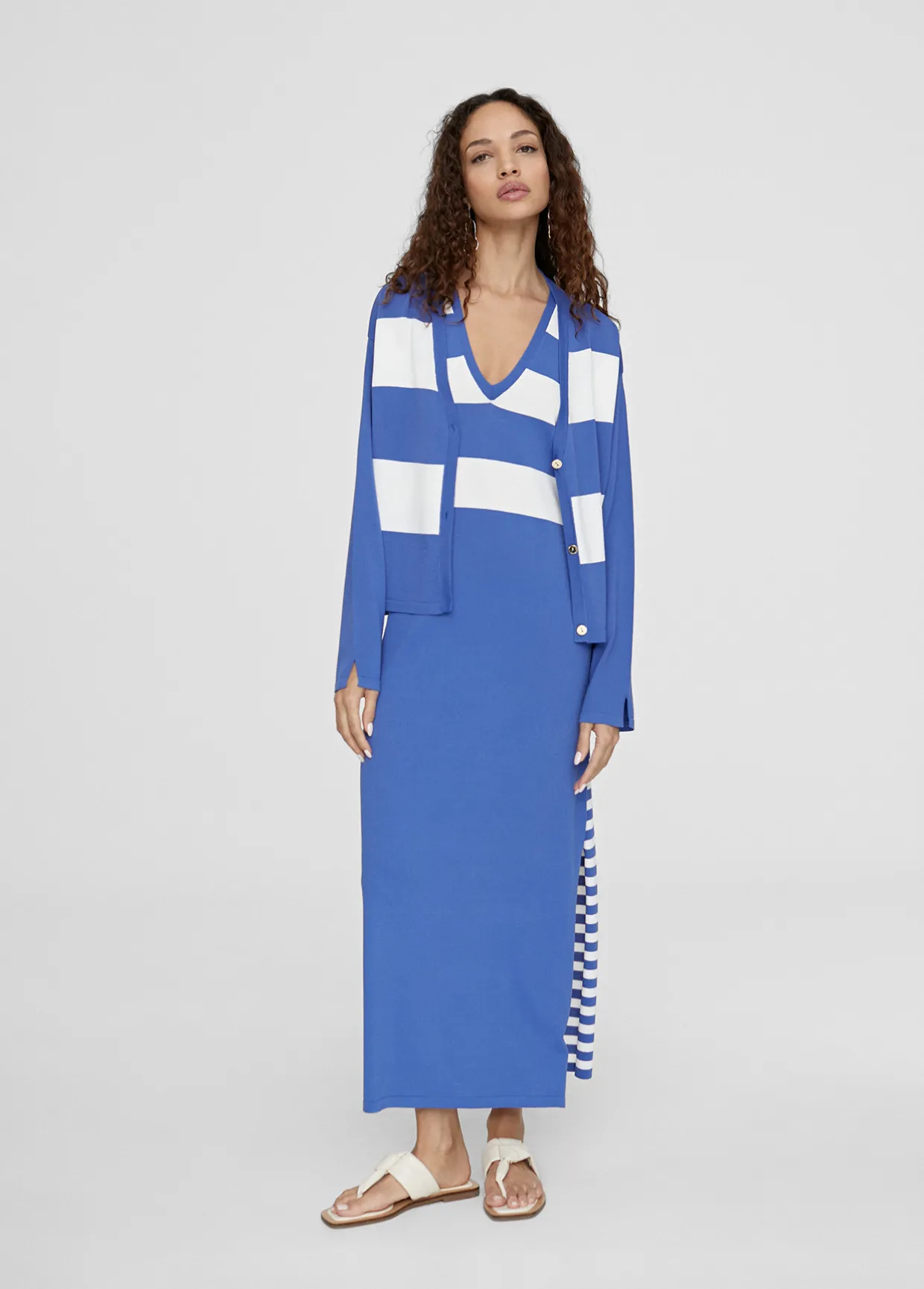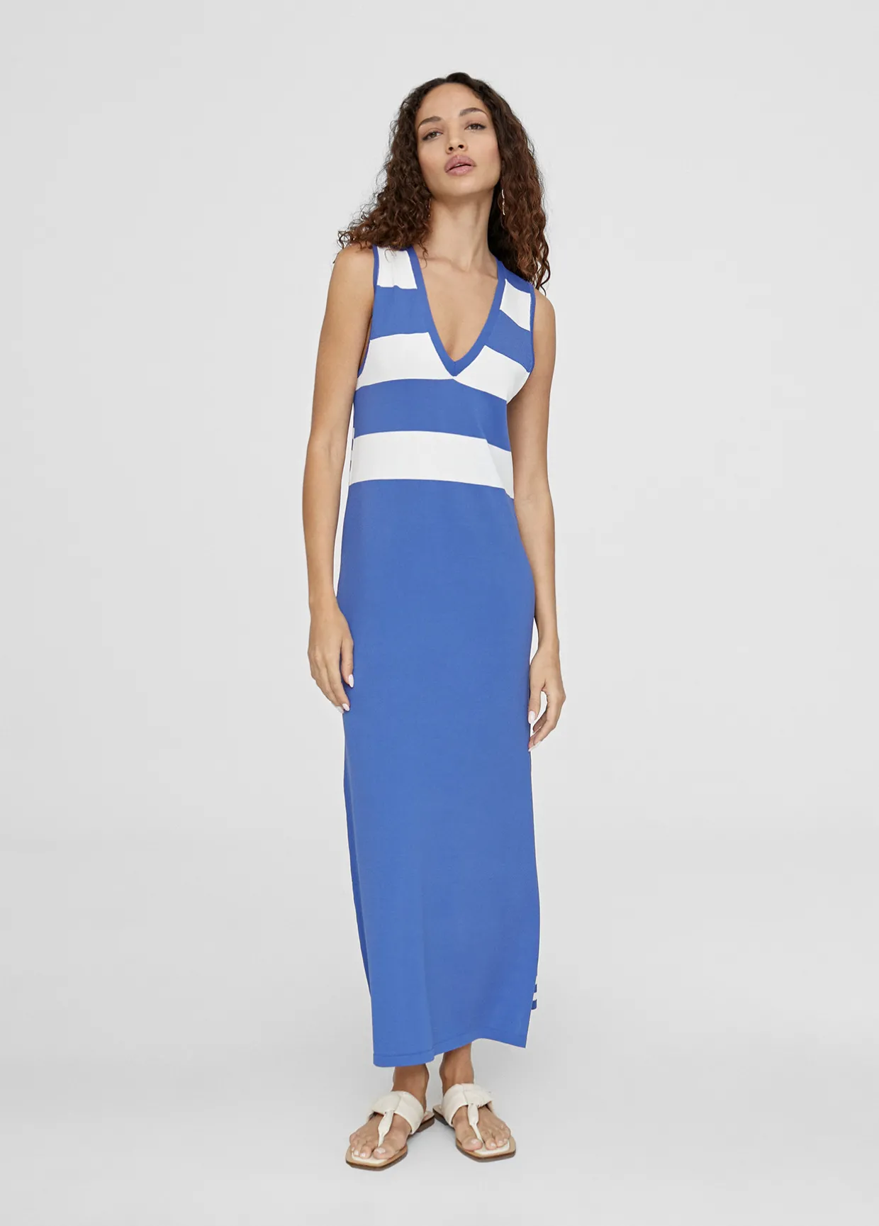 Vestido largo de punto. Rayas anchas bicolor en frontal cuerpo. Falda lisa. Escote pico y manga sisa. Aberturas laterales y espalda en rayas estrechas bicolor.