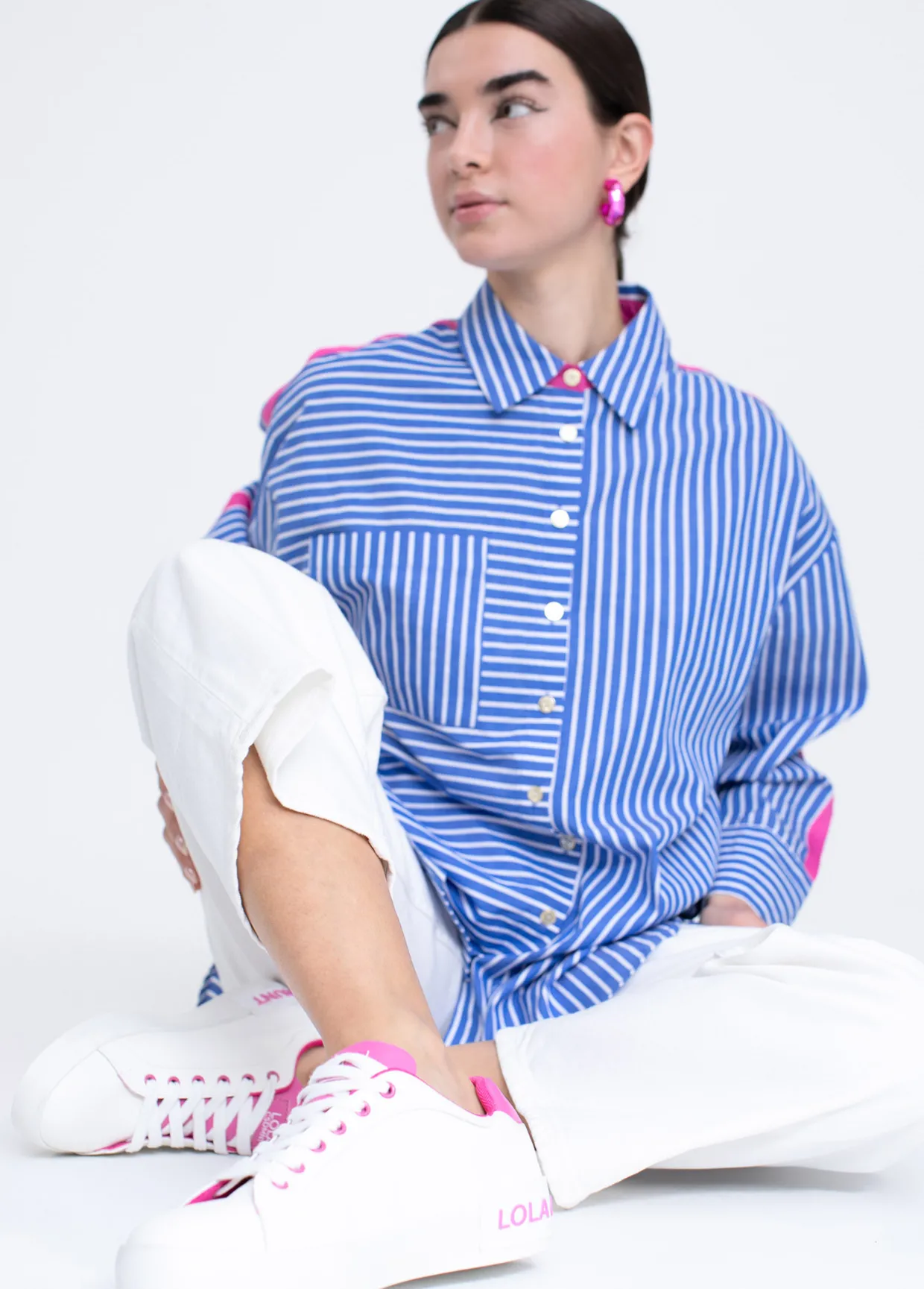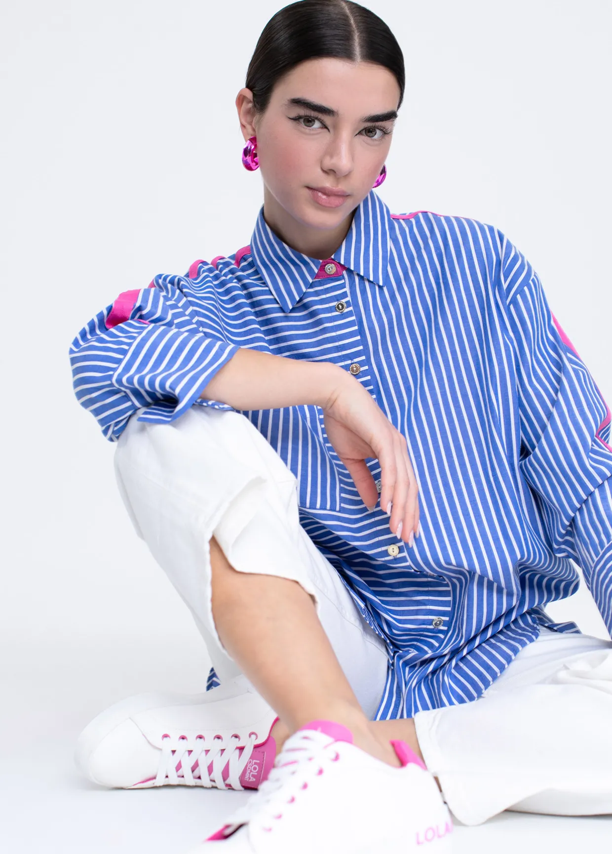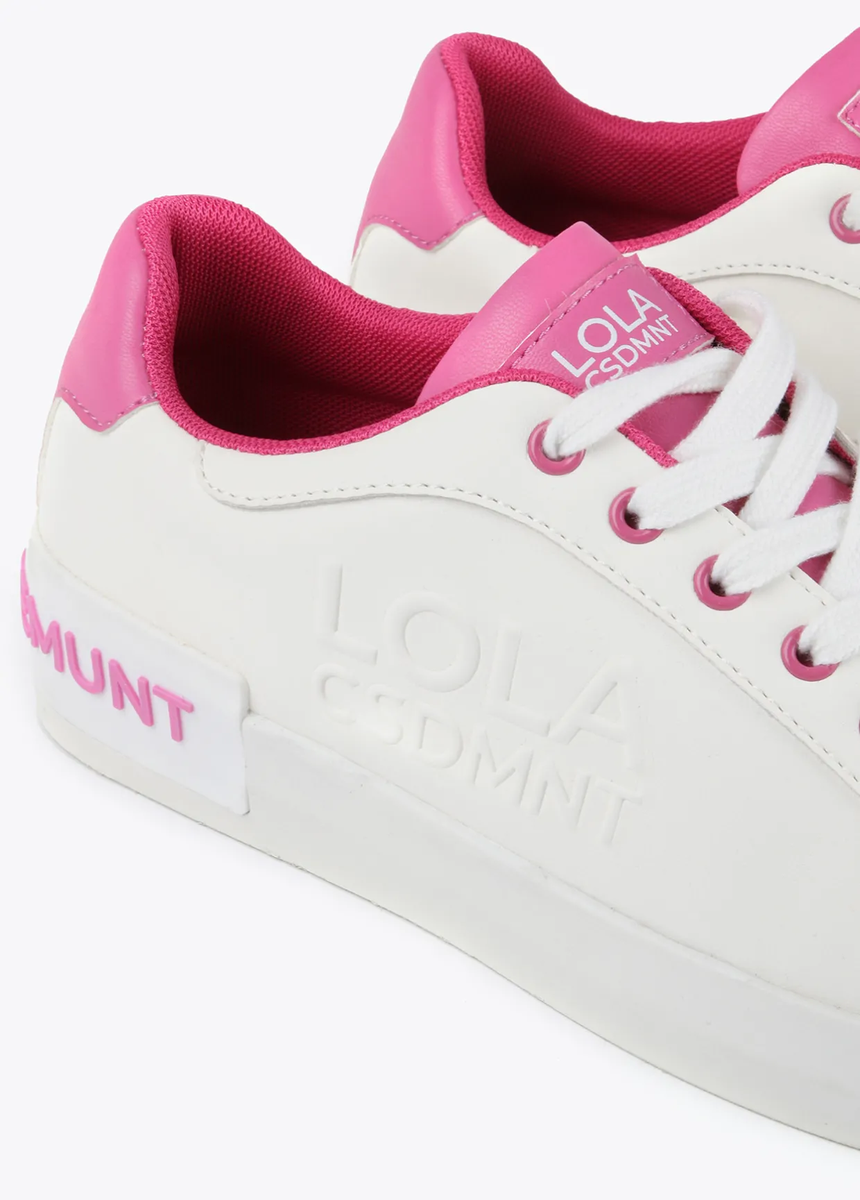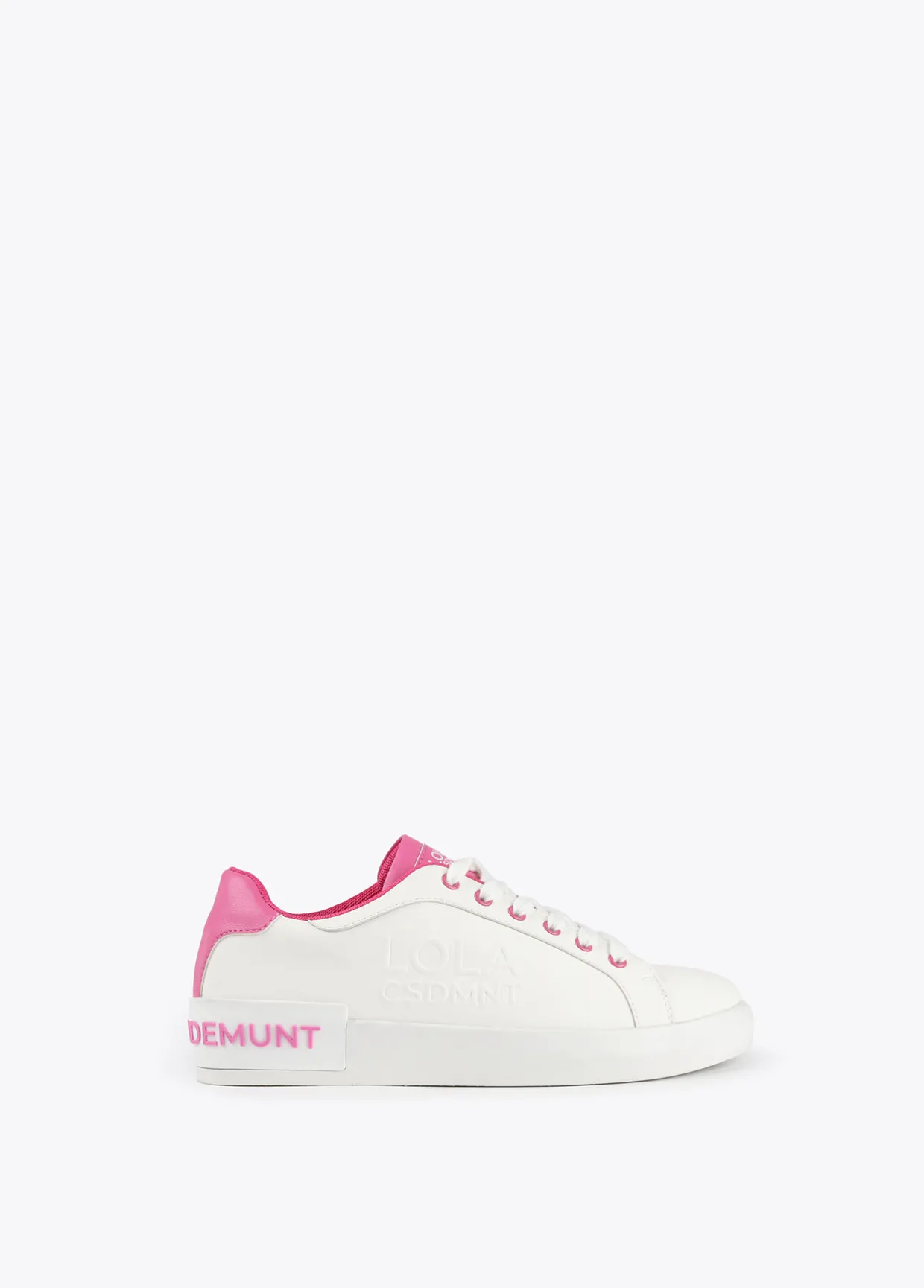 Zapatillas tipo sneakers blancas con detalles en color fucsia. Lengüeta y suela logotipadas.